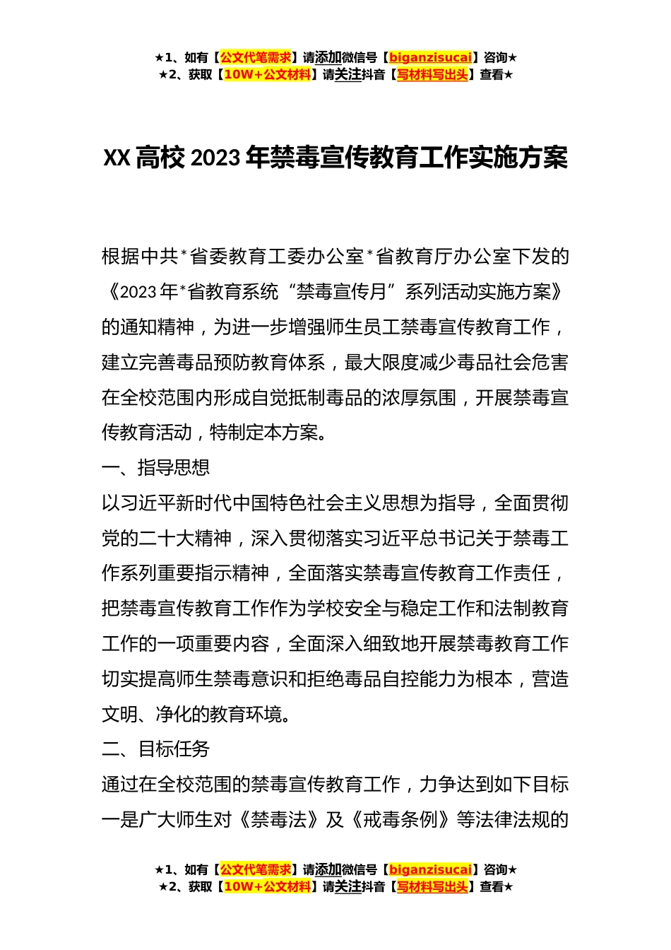 ★1、如有【公文代笔需求】请添加微信号【biganzisucai】咨询★★2、获取【10W+公文材料】请关注抖音【写材料写出头】查看★XX高校2023年禁毒宣传教育工作实施方案根据中共*省委教育工委办公室*省教育厅办公室下发的《2023年*省教育系统“禁毒宣传月”系列活动实施方案》的通知精神,为进一步增强师生员工禁毒宣传教育工作,建立完善毒品预防教育体系,最大限度减少毒品社会危害在全校范围内形成自觉抵制毒品的浓厚氛围,开展禁毒宣传教育活动,特制定本方案。一、指导思想以习近平新时代中国特色社会主义思想为指导,全面贯彻党的二十大精神,深入贯彻落实习近平总书记关于禁毒工作系列重要指示精神,全面落实禁毒宣传教育工作责任,把禁毒宣传教育工作作为学校安全与稳定工作和法制教育工作的一项重要内容,全面...