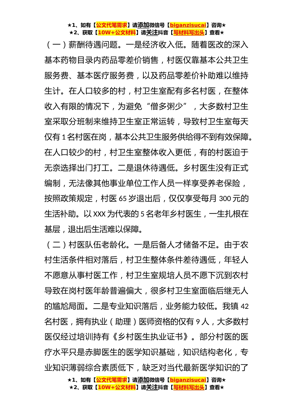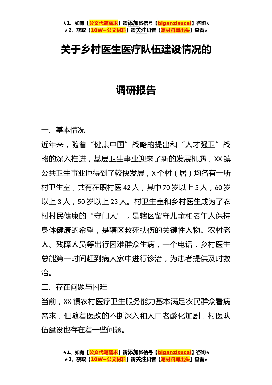★1、如有【公文代笔需求】请添加微信号【biganzisucai】咨询★★2、获取【10W+公文材料】请关注抖音【写材料写出头】查看★关于乡村医生医疗队伍建设情况的调研报告一、基本情况近年来,随着“健康中国”战略的提出和“人才强卫”战略的深入推进,基层卫生事业迎来了新的发展机遇,XX镇公共卫生事业也得到了较快发展,X个村(居)均各有一所村卫生室,共有在职村医42人,其中70岁以上5人,60岁以上3人,50岁以上23人。村卫生室和乡村医生成为了农村村民健康的“守门人”,是辖区留守儿童和老年人保持身体健康的希望,是辖区救死扶伤的关键性人物。农村老人、残障人员等出行困难群众生病,一个电话,乡村医生总能第一时间赶到病人家中进行诊治,为患者提供及时救治。二、存在问题与困难当前,XX镇农村医疗卫生服务...