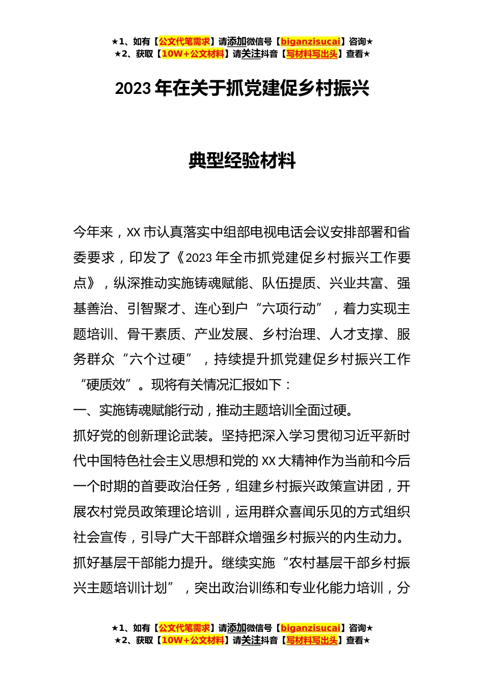 ★1、如有【公文代笔需求】请添加微信号【biganzisucai】咨询★★2、获取【10W+公文材料】请关注抖音【写材料写出头】查看★2023年在关于抓党建促乡村振兴典型经验材料今年来,XX市认真落实中组部电视电话会议安排部署和省委要求,印发了《2023年全市抓党建促乡村振兴工作要点》,纵深推动实施铸魂赋能、队伍提质、兴业共富、强基善治、引智聚才、连心到户“六项行动”,着力实现主题培训、骨干素质、产业发展、乡村治理、人才支撑、服务群众“六个过硬”,持续提升抓党建促乡村振兴工作“硬质效”。现将有关情况汇报如下:一、实施铸魂赋能行动,推动主题培训全面过硬。抓好党的创新理论武装。坚持把深入学习贯彻习近平新时代中国特色社会主义思想和党的XX大精神作为当前和今后一个时期的首要政治任务,组建乡村...