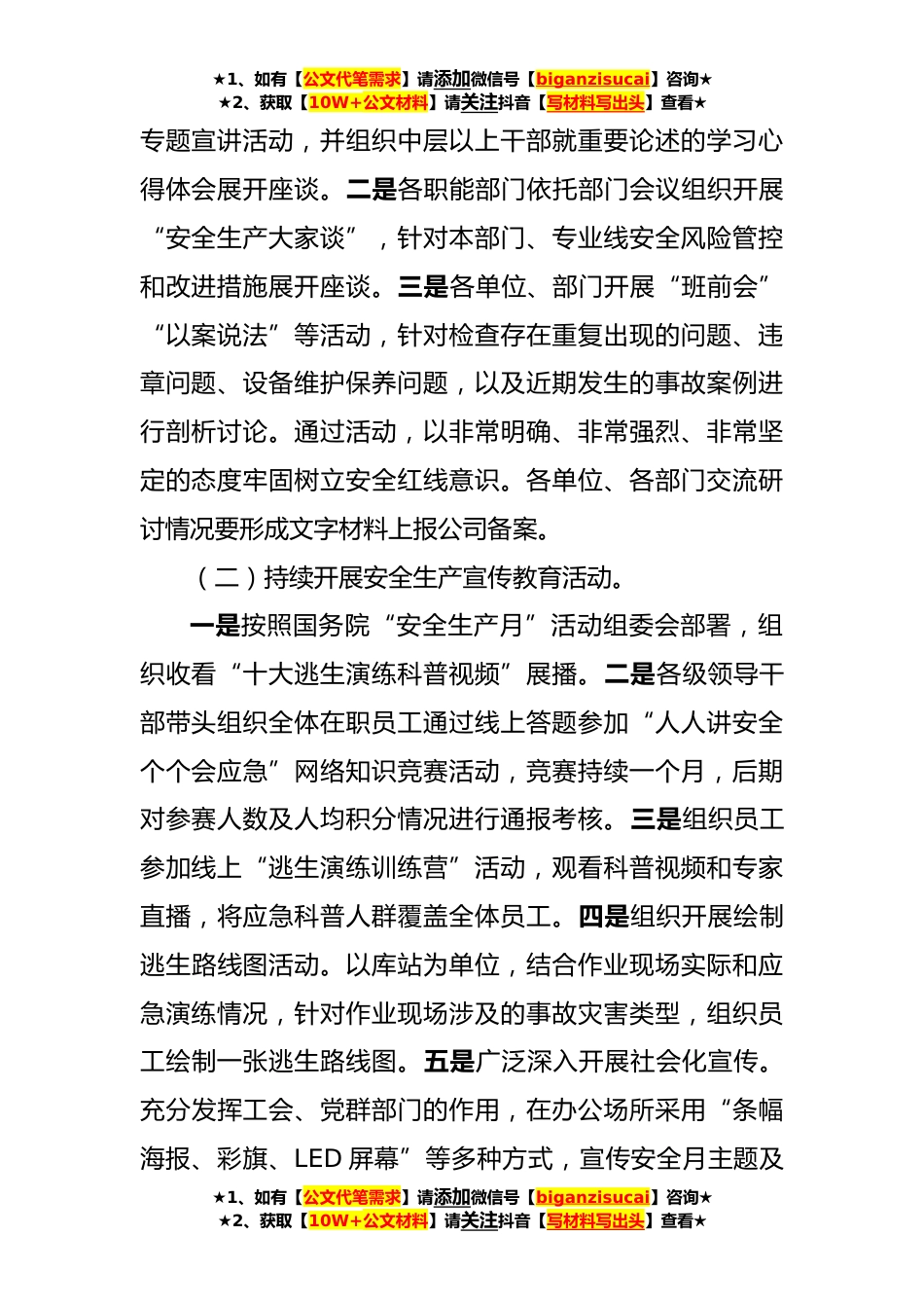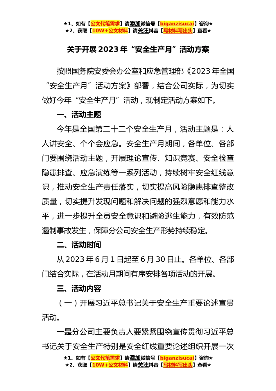 ★1、如有【公文代笔需求】请添加微信号【biganzisucai】咨询★★2、获取【10W+公文材料】请关注抖音【写材料写出头】查看★关于开展2023年“安全生产月”活动方案按照国务院安委会办公室和应急管理部《2023年全国“安全生产月”活动方案》部署,结合公司实际,为切实做好今年“安全生产月”活动,现制定活动方案如下。一、活动主题今年是全国第二十二个安全生产月,活动主题是:人人讲安全、个个会应急。安全生产月期间,各单位、各部门要围绕活动主题,开展理论宣传、知识竞赛、安全检查隐患排查、应急演练等一系列活动,持续树牢安全红线意识,推动安全生产责任落实,切实提高风险隐患排查整改质量,切实提升发现问题和解决问题的强烈意愿和能力水平,进一步提升全员安全意识和避险逃生能力,有效防范遏制事故...