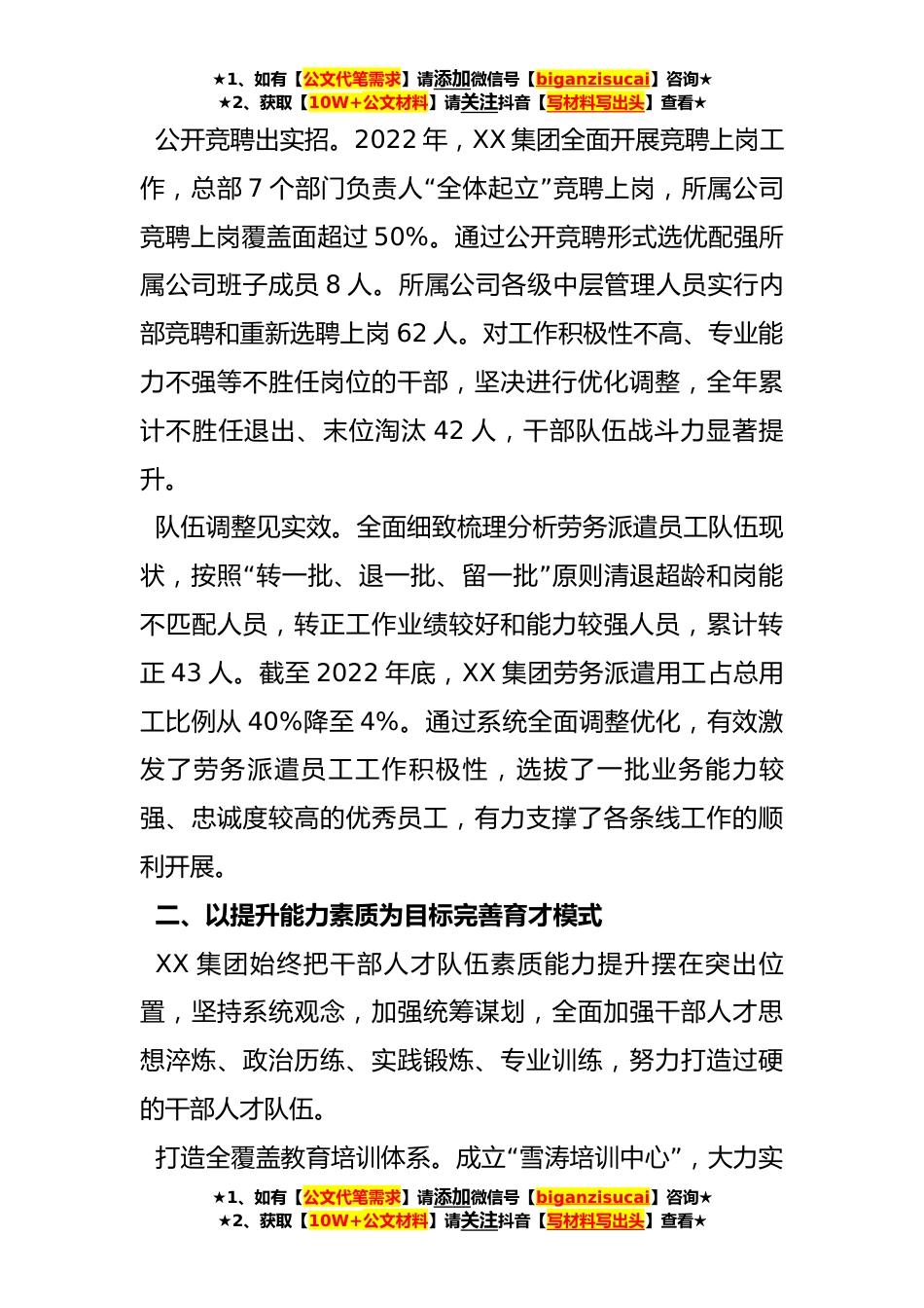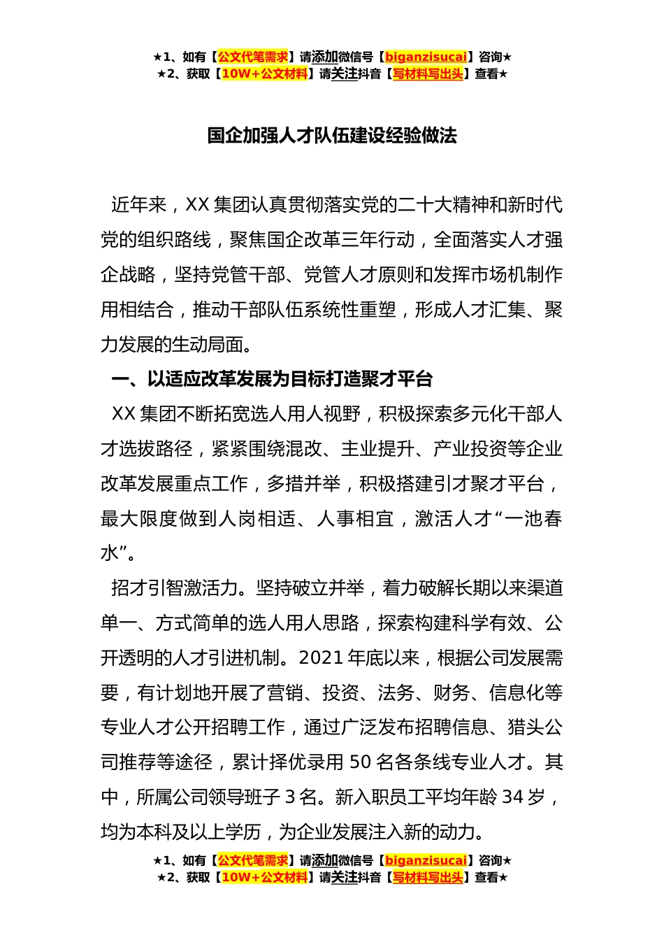 ★1、如有【公文代笔需求】请添加微信号【biganzisucai】咨询★★2、获取【10W+公文材料】请关注抖音【写材料写出头】查看★国企加强人才队伍建设经验做法近年来,XX集团认真贯彻落实党的二十大精神和新时代党的组织路线,聚焦国企改革三年行动,全面落实人才强企战略,坚持党管干部、党管人才原则和发挥市场机制作用相结合,推动干部队伍系统性重塑,形成人才汇集、聚力发展的生动局面。一、以适应改革发展为目标打造聚才平台XX集团不断拓宽选人用人视野,积极探索多元化干部人才选拔路径,紧紧围绕混改、主业提升、产业投资等企业改革发展重点工作,多措并举,积极搭建引才聚才平台,“最大限度做到人岗相适、人事相宜,激活人才一池春”水。招才引智激活力。坚持破立并举,着力破解长期以来渠道单一、方式简单...