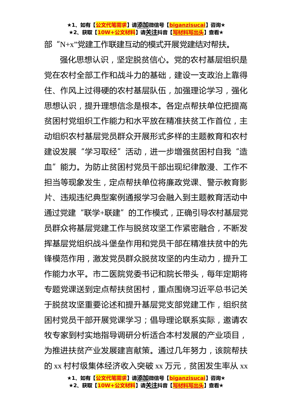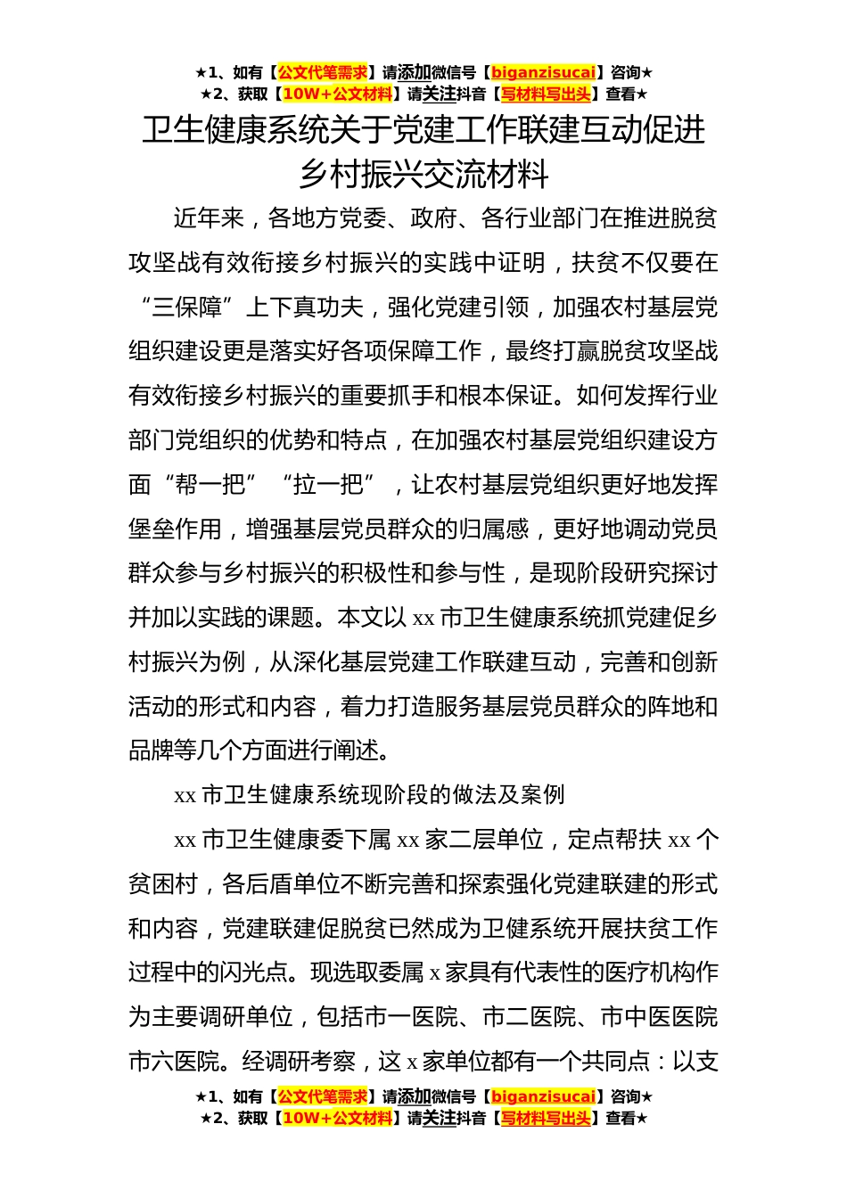 ★1、如有【公文代笔需求】请添加微信号【biganzisucai】咨询★★2、获取【10W+公文材料】请关注抖音【写材料写出头】查看★卫生健康系统关于党建工作联建互动促进乡村振兴交流材料近年来,各地方党委、政府、各行业部门在推进脱贫攻坚战有效衔接乡村振兴的实践中证明,扶贫不仅要在“三保障”上下真功夫,强化党建引领,加强农村基层党组织建设更是落实好各项保障工作,最终打赢脱贫攻坚战有效衔接乡村振兴的重要抓手和根本保证。如何发挥行业部门党组织的优势和特点,在加强农村基层党组织建设方面“帮一把”“拉一把”,让农村基层党组织更好地发挥堡垒作用,增强基层党员群众的归属感,更好地调动党员群众参与乡村振兴的积极性和参与性,是现阶段研究探讨并加以实践的课题。本文以xx市卫生健康系统抓党建促乡...