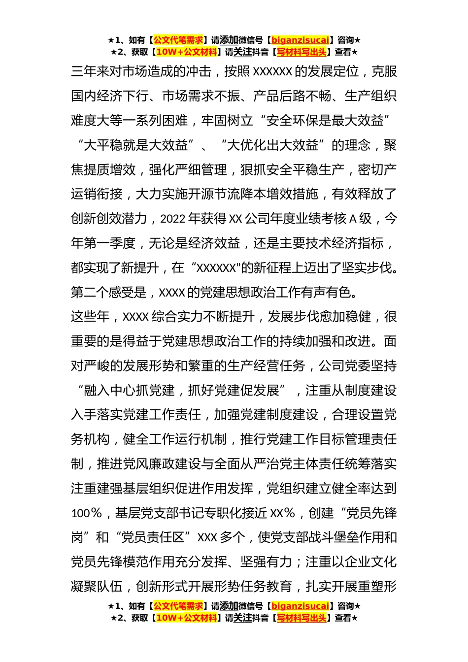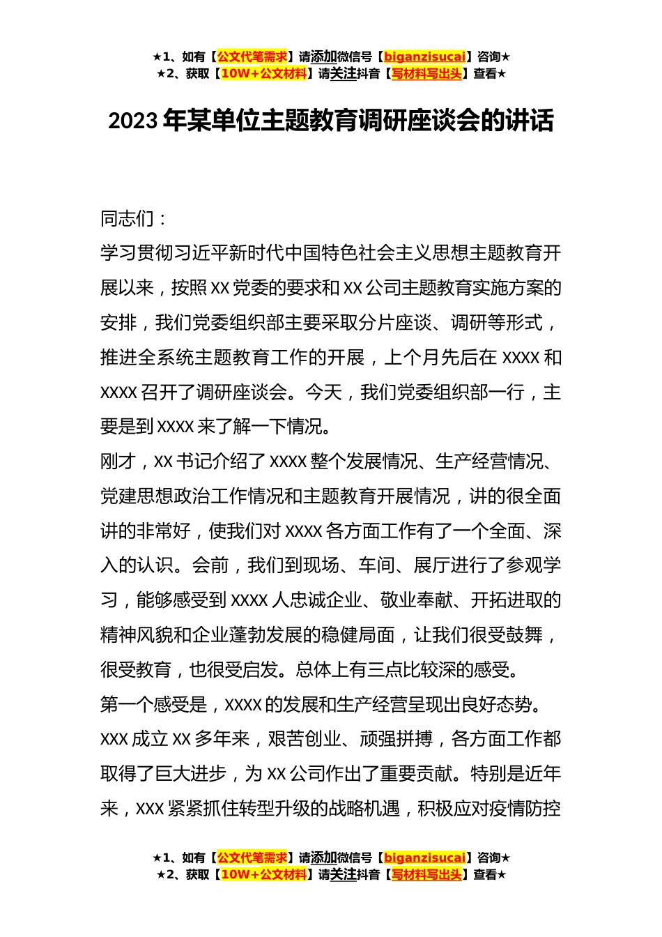 ★1、如有【公文代笔需求】请添加微信号【biganzisucai】咨询★★2、获取【10W+公文材料】请关注抖音【写材料写出头】查看★2023年某单位主题教育调研座谈会的讲话同志们:学习贯彻习近平新时代中国特色社会主义思想主题教育开展以来,按照XX党委的要求和XX公司主题教育实施方案的安排,我们党委组织部主要采取分片座谈、调研等形式,推进全系统主题教育工作的开展,上个月先后在XXXX和XXXX召开了调研座谈会。今天,我们党委组织部一行,主要是到XXXX来了解一下情况。刚才,XX书记介绍了XXXX整个发展情况、生产经营情况、党建思想政治工作情况和主题教育开展情况,讲的很全面讲的非常好,使我们对XXXX各方面工作有了一个全面、深入的认识。会前,我们到现场、车间、展厅进行了参观学习,能够感受到XXXX人忠诚企业...