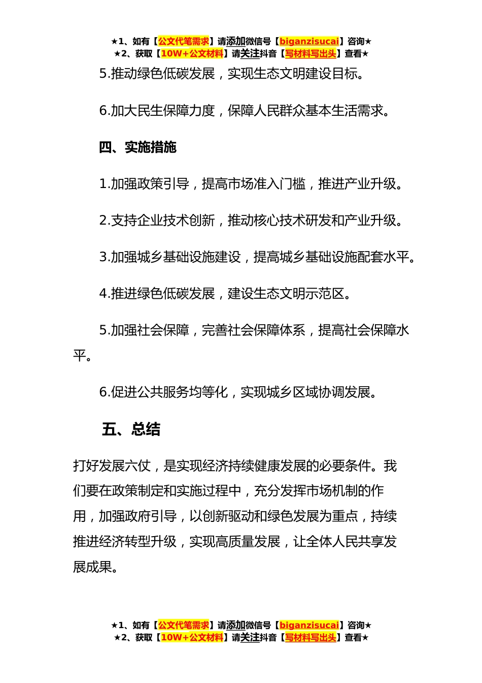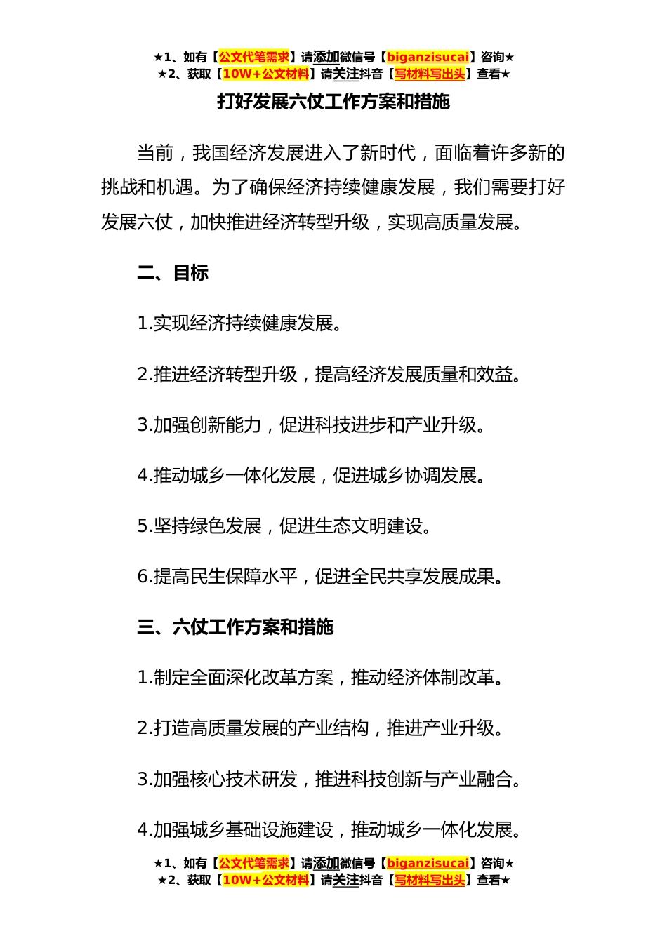 ★1、如有【公文代笔需求】请添加微信号【biganzisucai】咨询★★2、获取【10W+公文材料】请关注抖音【写材料写出头】查看★打好发展六仗工作方案和措施当前,我国经济发展进入了新时代,面临着许多新的挑战和机遇。为了确保经济持续健康发展,我们需要打好发展六仗,加快推进经济转型升级,实现高质量发展。二、目标1.实现经济持续健康发展。2.推进经济转型升级,提高经济发展质量和效益。3.加强创新能力,促进科技进步和产业升级。4.推动城乡一体化发展,促进城乡协调发展。5.坚持绿色发展,促进生态文明建设。6.提高民生保障水平,促进全民共享发展成果。三、六仗工作方案和措施1.制定全面深化改革方案,推动经济体制改革。2.打造高质量发展的产业结构,推进产业升级。3.加强核心技术研发,推进科技创新与产业...