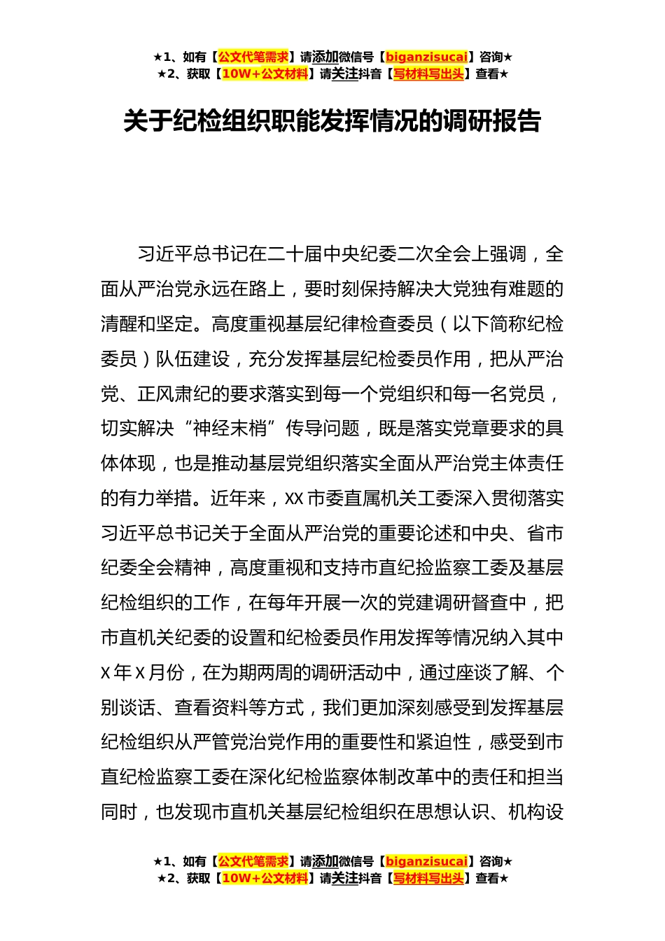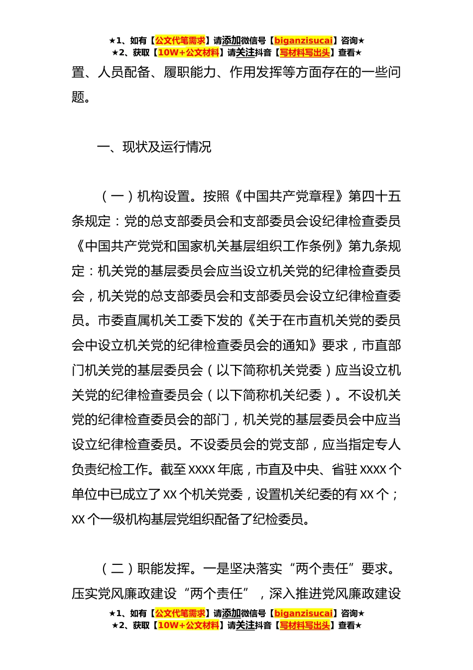 ★1、如有【公文代笔需求】请添加微信号【biganzisucai】咨询★★2、获取【10W+公文材料】请关注抖音【写材料写出头】查看★关于纪检组织职能发挥情况的调研报告习近平总书记在二十届中央纪委二次全会上强调,全面从严治党永远在路上,要时刻保持解决大党独有难题的清醒和坚定。高度重视基层纪律检查委员(以下简称纪检委员)队伍建设,充分发挥基层纪检委员作用,把从严治党、正风肃纪的要求落实到每一个党组织和每一名党员,切实解决“神经末梢”传导问题,既是落实党章要求的具体体现,也是推动基层党组织落实全面从严治党主体责任的有力举措。近年来,XX市委直属机关工委深入贯彻落实习近平总书记关于全面从严治党的重要论述和中央、省市纪委全会精神,高度重视和支持市直纪捡监察工委及基层纪检组织的工作,...