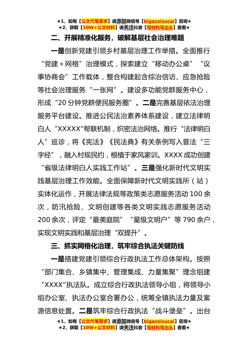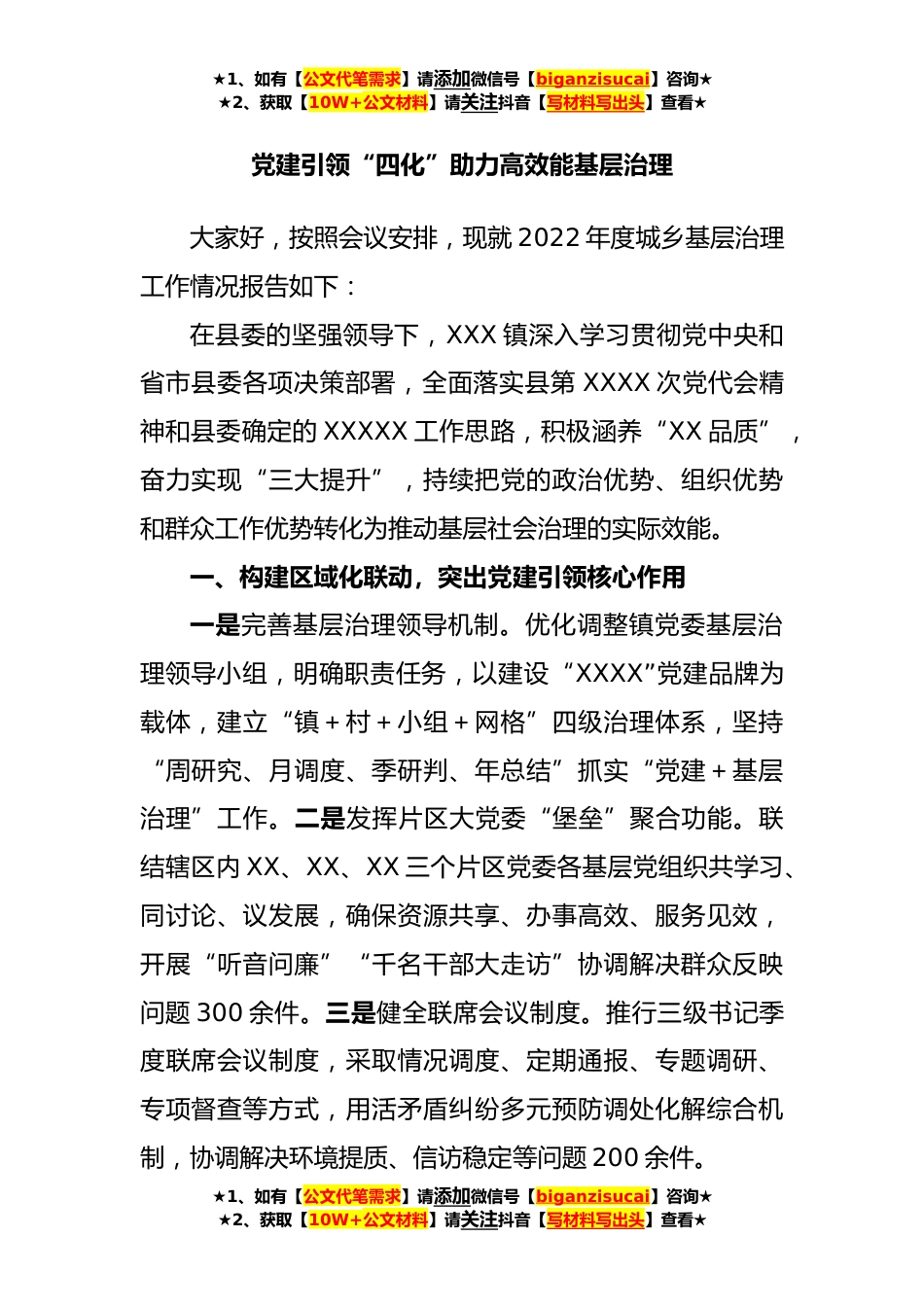★1、如有【公文代笔需求】请添加微信号【biganzisucai】咨询★★2、获取【10W+公文材料】请关注抖音【写材料写出头】查看★党建引领“四化”助力高效能基层治理大家好,按照会议安排,现就2022年度城乡基层治理工作情况报告如下:在县委的坚强领导下,XXX镇深入学习贯彻党中央和省市县委各项决策部署,全面落实县第XXXX次党代会精神和县委确定的XXXXX工作思路,积极涵养“XX品质”,奋力实现“三大提升”,持续把党的政治优势、组织优势和群众工作优势转化为推动基层社会治理的实际效能。一、构建区域化联动,突出党建引领核心作用一是完善基层治理领导机制。优化调整镇党委基层治理领导小组,明确职责任务,以建设“XXXX”党建品牌为载体,建立“镇+村+小组+网格”四级治理体系,坚持“周研究、月调度、季研...