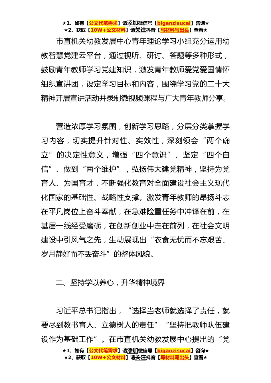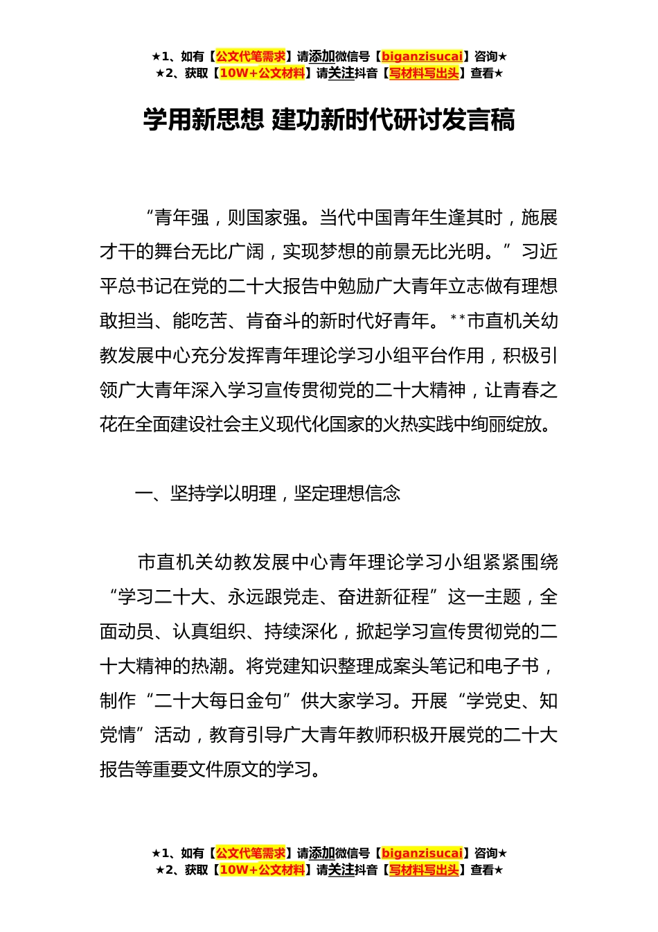 ★1、如有【公文代笔需求】请添加微信号【biganzisucai】咨询★★2、获取【10W+公文材料】请关注抖音【写材料写出头】查看★学用新思想建功新时代研讨发言稿“青年强,则国家强。当代中国青年生逢其时,施展才干的舞台无比广阔,实现梦想的前景无比光明。”习近平总书记在党的二十大报告中勉励广大青年立志做有理想敢担当、能吃苦、肯奋斗的新时代好青年。**市直机关幼教发展中心充分发挥青年理论学习小组平台作用,积极引领广大青年深入学习宣传贯彻党的二十大精神,让青春之花在全面建设社会主义现代化国家的火热实践中绚丽绽放。一、坚持学以明理,坚定理想信念市直机关幼教发展中心青年理论学习小组紧紧围绕“学习二十大、永远跟党走、奋进新征程”这一主题,全面动员、认真组织、持续深化,掀起学习宣传贯彻...