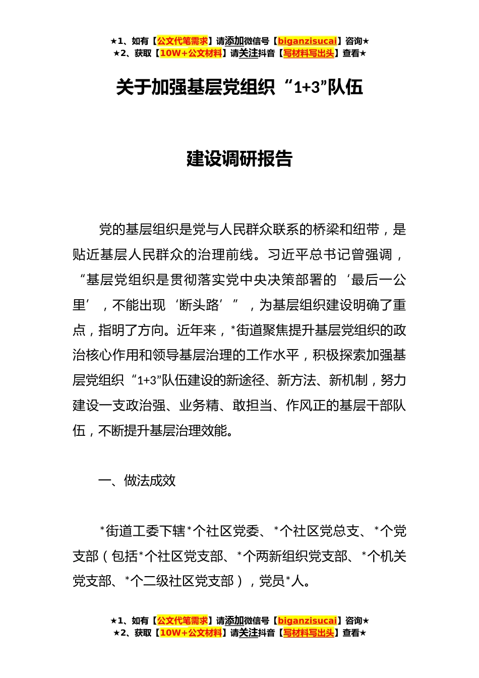 ★1、如有【公文代笔需求】请添加微信号【biganzisucai】咨询★★2、获取【10W+公文材料】请关注抖音【写材料写出头】查看★关于加强基层党组织“1+3”队伍建设调研报告党的基层组织是党与人民群众联系的桥梁和纽带,是贴近基层人民群众的治理前线。习近平总书记曾强调,“基层党组织是贯彻落实党中央决策部署的‘最后一公里’,不能出现‘断头路’”,为基层组织建设明确了重点,指明了方向。近年来,*街道聚焦提升基层党组织的政治核心作用和领导基层治理的工作水平,积极探索加强基层党组织“1+3”队伍建设的新途径、新方法、新机制,努力建设一支政治强、业务精、敢担当、作风正的基层干部队伍,不断提升基层治理效能。一、做法成效*街道工委下辖*个社区党委、*个社区党总支、*个党支部(包括*个社区党支部、*...