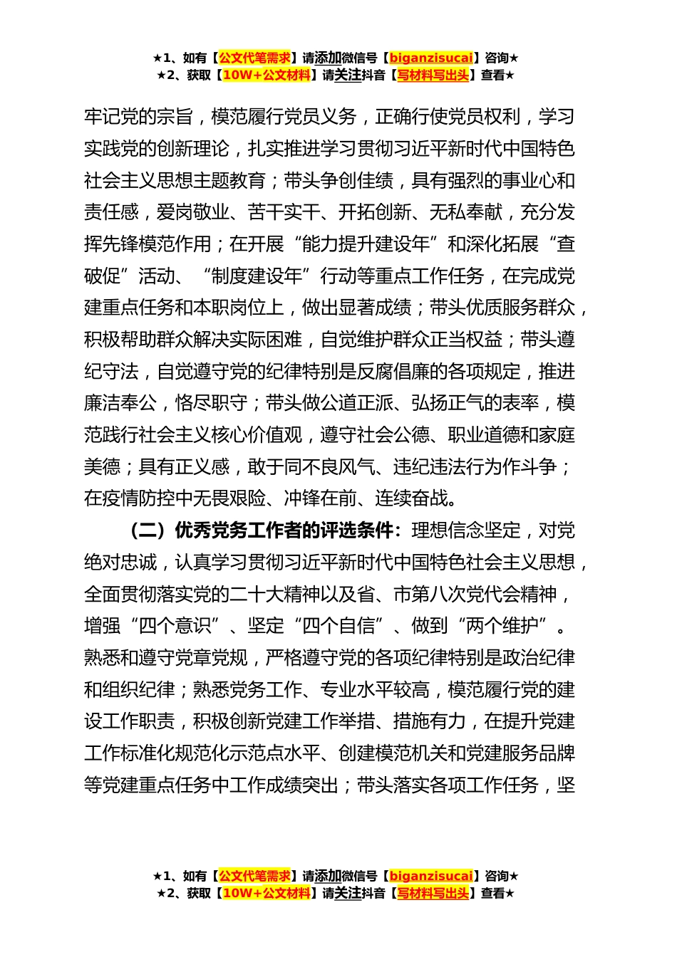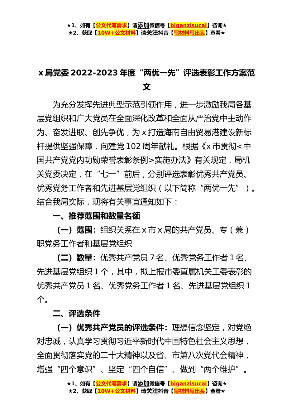 ★1、如有【公文代笔需求】请添加微信号【biganzisucai】咨询★★2、获取【10W+公文材料】请关注抖音【写材料写出头】查看★x局党委2022-2023年度“两优一先”评选表彰工作方案范文为充分发挥先进典型示范引领作用,进一步激励我局各基层党组织和广大党员在全面深化改革和全面从严治党中主动作为、奋发进取、创先争优,为x打造海南自由贸易港建设新标杆提供坚强保障,向建党102周年献礼。根据《x市贯彻<中国共产党党内功勋荣誉表彰条例>实施办法》有关规定,局机关党委决定,在“七一”前后,分别评选表彰优秀共产党员、优秀党务工作者和先进基层党组织(以下简称“两优一先”)。结合我局实际,现将有关事宜通知如下:一、推荐范围和数量名额(一)范围:组织关系在x市x局的共产党员、专(兼)职党务工作者和基层...