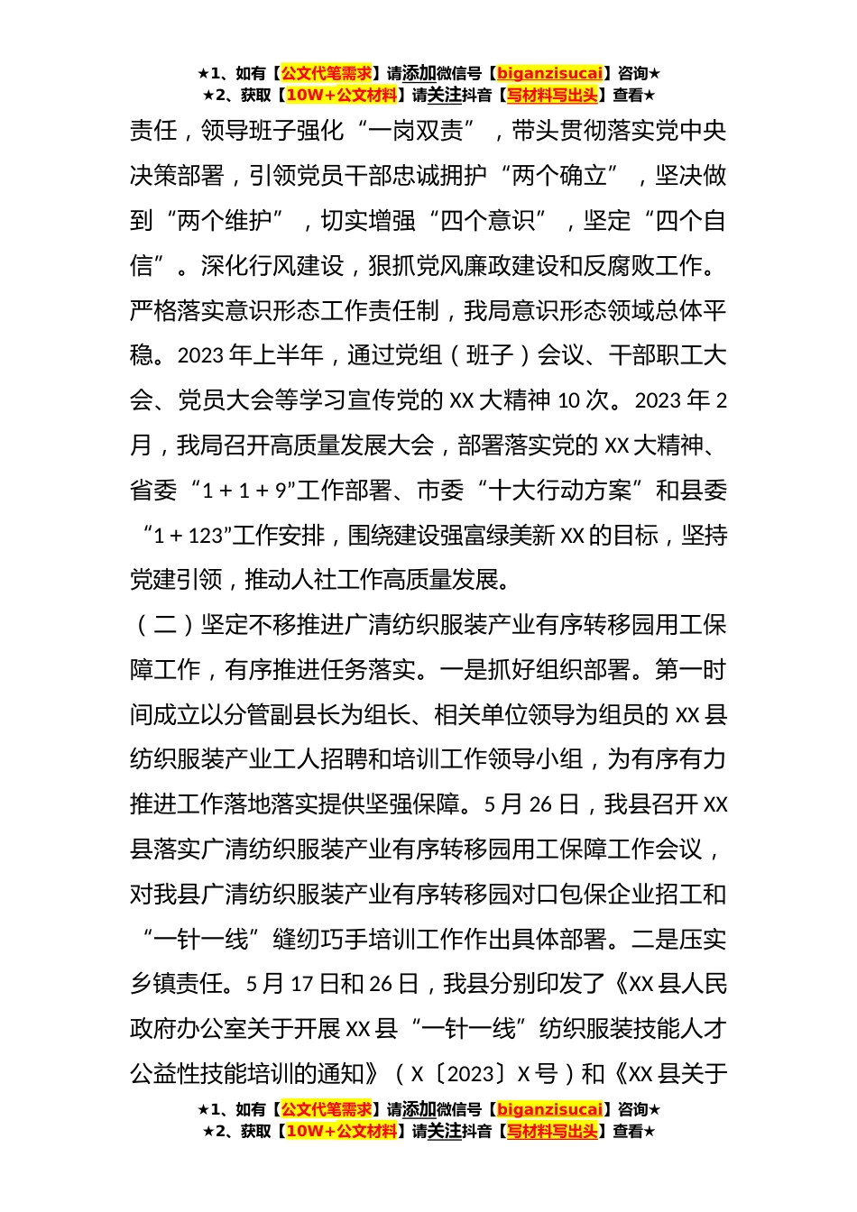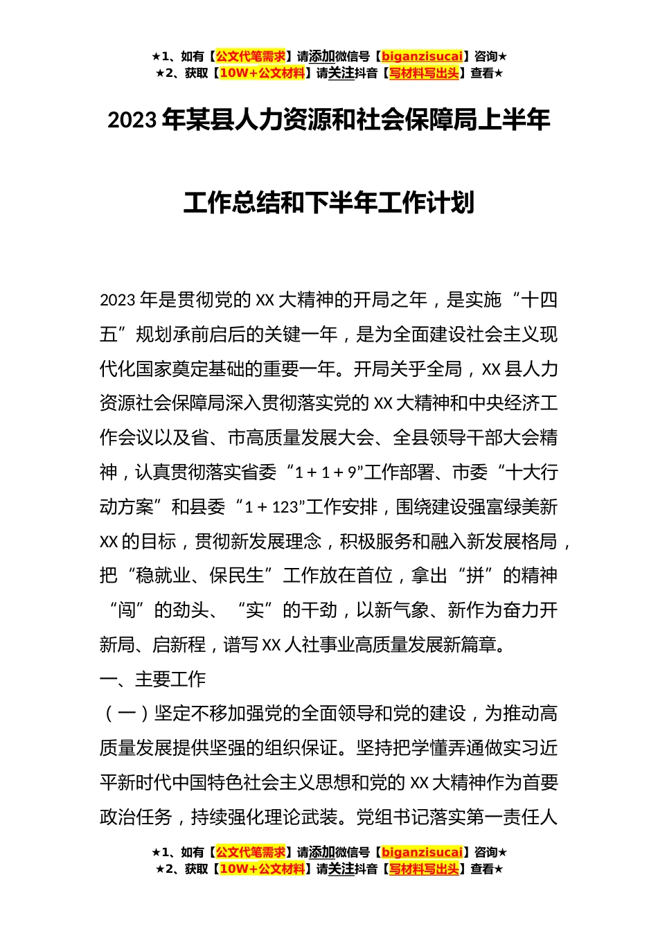 ★1、如有【公文代笔需求】请添加微信号【biganzisucai】咨询★★2、获取【10W+公文材料】请关注抖音【写材料写出头】查看★2023年某县人力资源和社会保障局上半年工作总结和下半年工作计划2023年是贯彻党的XX大精神的开局之年,是实施“十四五”规划承前启后的关键一年,是为全面建设社会主义现代化国家奠定基础的重要一年。开局关乎全局,XX县人力资源社会保障局深入贯彻落实党的XX大精神和中央经济工作会议以及省、市高质量发展大会、全县领导干部大会精神,认真贯彻落实省委“1+1+9”工作部署、市委“十大行动方案”和县委“1+123”工作安排,围绕建设强富绿美新XX的目标,贯彻新发展理念,积极服务和融入新发展格局,把“稳就业、保民生”工作放在首位,拿出“拼”的精神“闯”的劲头、“实”的干劲,以新...