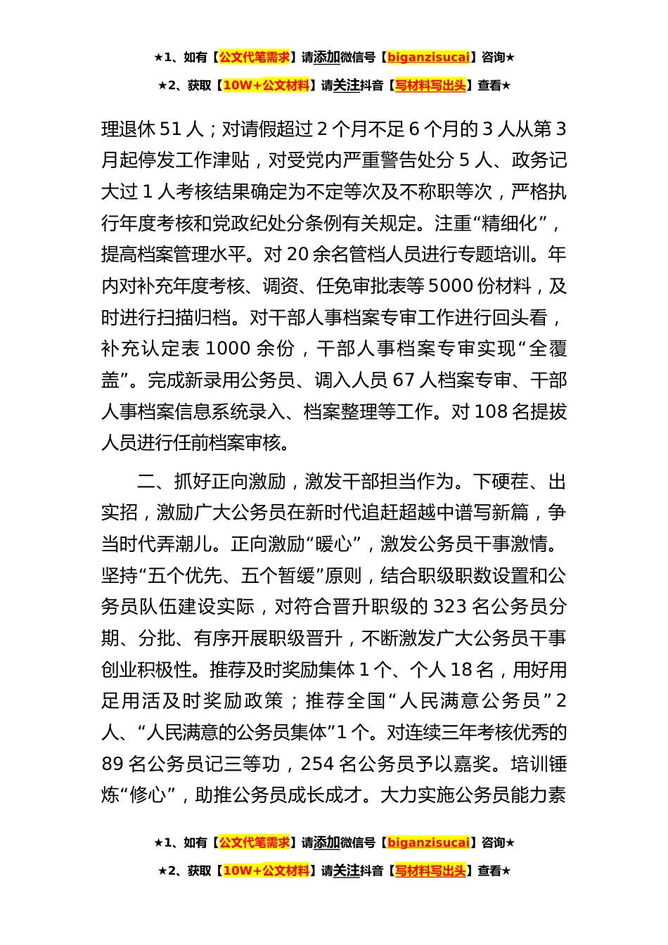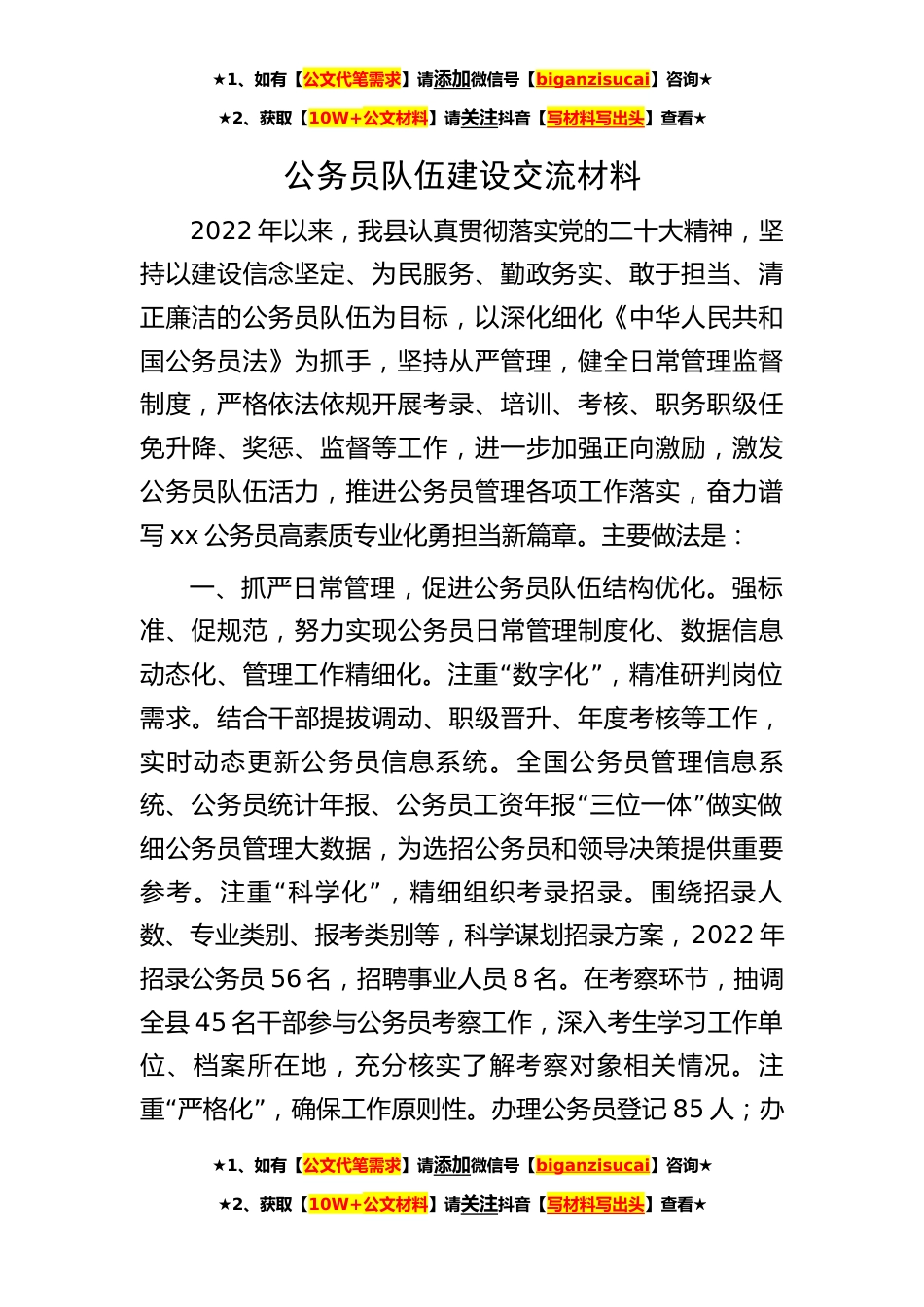 ★1、如有【公文代笔需求】请添加微信号【biganzisucai】咨询★★2、获取【10W+公文材料】请关注抖音【写材料写出头】查看★公务员队伍建设交流材料2022年以来,我县认真贯彻落实党的二十大精神,坚持以建设信念坚定、为民服务、勤政务实、敢于担当、清正廉洁的公务员队伍为目标,以深化细化《中华人民共和国公务员法》为抓手,坚持从严管理,健全日常管理监督制度,严格依法依规开展考录、培训、考核、职务职级任免升降、奖惩、监督等工作,进一步加强正向激励,激发公务员队伍活力,推进公务员管理各项工作落实,奋力谱写xx公务员高素质专业化勇担当新篇章。主要做法是:一、抓严日常管理,促进公务员队伍结构优化。强标准、促规范,努力实现公务员日常管理制度化、数据信息“”动态化、管理工作精细化。注重数...