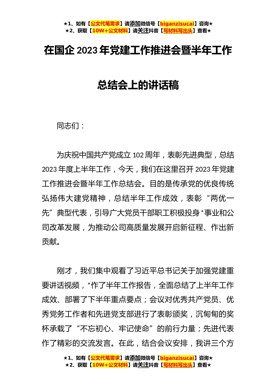 ★1、如有【公文代笔需求】请添加微信号【biganzisucai】咨询★★2、获取【10W+公文材料】请关注抖音【写材料写出头】查看★在国企2023年党建工作推进会暨半年工作总结会上的讲话稿同志们:为庆祝中国共产党成立102周年,表彰先进典型,总结2023年度上半年工作,今天,我们在这里召开2023年党建工作推进会暨半年工作总结会。目的是传承党的优良传统弘扬伟大建党精神,总结半年工作成效,表彰“两优一先”典型代表,引导广大党员干部职工积极投身*事业和公司改革发展,为推动公司高质量发展开启新征程、作出新贡献。刚才,我们集中观看了习近平总书记关于加强党建重要讲话视频,*作了半年工作报告,全面总结了上半年工作成效、部署了下半年重点要点;会议对优秀共产党员、优秀党务工作者和先进党支部进行了表彰颁奖...