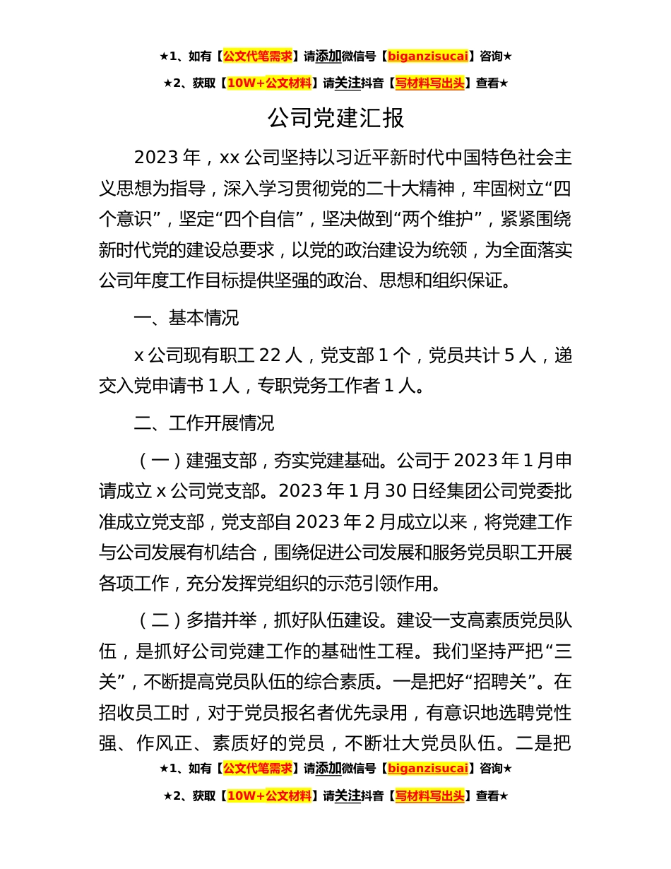 ★1、如有【公文代笔需求】请添加微信号【biganzisucai】咨询★★2、获取【10W+公文材料】请关注抖音【写材料写出头】查看★公司党建汇报2023年,xx公司坚持以习近平新时代中国特色社会主“义思想为指导,深入学习贯彻党的二十大精神,牢固树立四”“”“”个意识,坚定四个自信,坚决做到两个维护,紧紧围绕新时代党的建设总要求,以党的政治建设为统领,为全面落实公司年度工作目标提供坚强的政治、思想和组织保证。一、基本情况x公司现有职工22人,党支部1个,党员共计5人,递交入党申请书1人,专职党务工作者1人。二、工作开展情况(一)建强支部,夯实党建基础。公司于2023年1月申请成立x公司党支部。2023年1月30日经集团公司党委批准成立党支部,党支部自2023年2月成立以来,将党建工作与公司发展有机结合,...