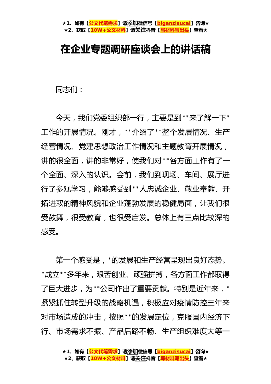 ★1、如有【公文代笔需求】请添加微信号【biganzisucai】咨询★★2、获取【10W+公文材料】请关注抖音【写材料写出头】查看★在企业专题调研座谈会上的讲话稿同志们:今天,我们党委组织部一行,主要是到**来了解一下*工作的开展情况。刚才,**介绍了**整个发展情况、生产经营情况、党建思想政治工作情况和主题教育开展情况,讲的很全面,讲的非常好,使我们对**各方面工作有了一个全面、深入的认识。会前,我们到现场、车间、展厅进行了参观学习,能够感受到**人忠诚企业、敬业奉献、开拓进取的精神风貌和企业蓬勃发展的稳健局面,让我们很受鼓舞,很受教育,也很受启发。总体上有三点比较深的感受。第一个感受是,*的发展和生产经营呈现出良好态势。*成立**多年来,艰苦创业、顽强拼搏,各方面工作都取得了巨大进...