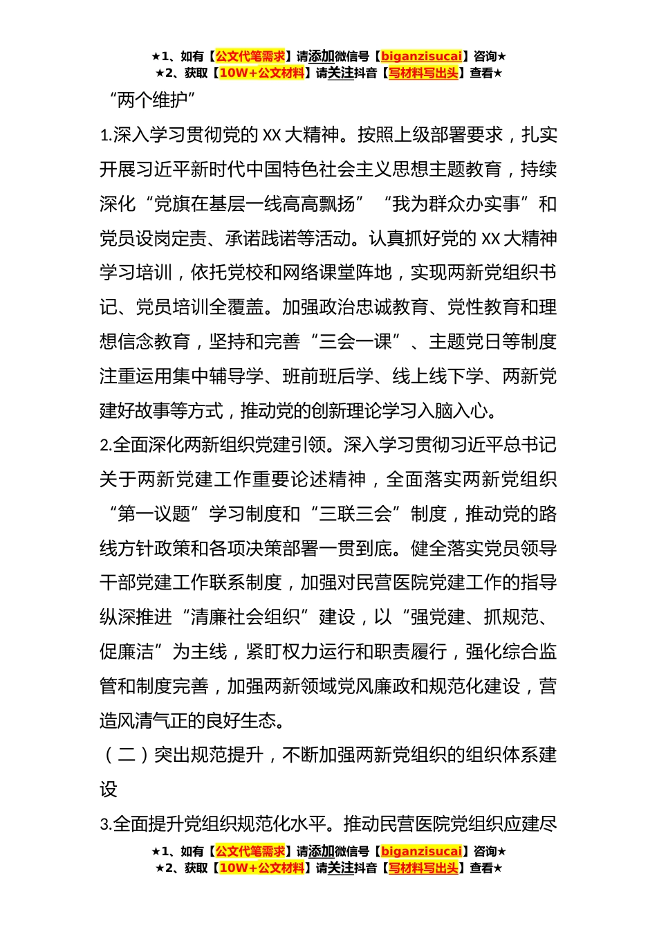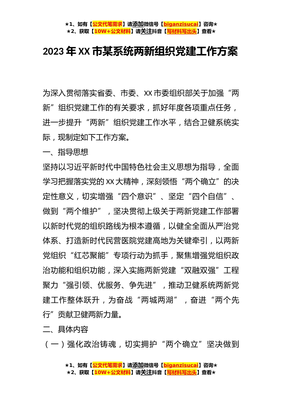 ★1、如有【公文代笔需求】请添加微信号【biganzisucai】咨询★★2、获取【10W+公文材料】请关注抖音【写材料写出头】查看★2023年XX市某系统两新组织党建工作方案为深入贯彻落实省委、市委、XX市委组织部关于加强“两新”组织党建工作的有关要求,抓好年度各项重点任务,进一步提升“两新”组织党建工作水平,结合卫健系统实际,现制定如下工作方案。一、指导思想坚持以习近平新时代中国特色社会主义思想为指导,全面学习把握落实党的XX大精神,深刻领悟“两个确立”的决定性意义,切实增强“四个意识”、坚定“四个自信”、做到“两个维护”,坚决贯彻上级关于两新党建工作部署以新时代党的组织路线为根本遵循,以健全全面从严治党体系、打造新时代民营医院党建高地为关键牵引,以两新党组织“红芯聚能”专项行...
