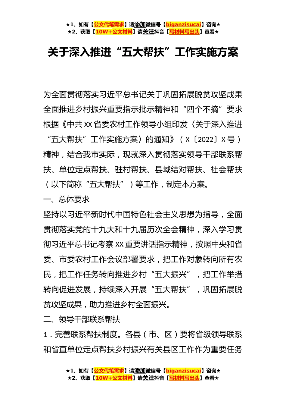 ★1、如有【公文代笔需求】请添加微信号【biganzisucai】咨询★★2、获取【10W+公文材料】请关注抖音【写材料写出头】查看★关于深入推进“五大帮扶”工作实施方案为全面贯彻落实习近平总书记关于巩固拓展脱贫攻坚成果全面推进乡村振兴重要指示批示精神和“四个不摘”要求根据《中共XX省委农村工作领导小组印发〈关于深入推进“五大帮扶”工作实施方案〉的通知》(X〔2022〕X号)精神,结合我市实际,现就深入贯彻落实领导干部联系帮扶、单位定点帮扶、驻村帮扶、县域结对帮扶、社会帮扶(以下简称“五大帮扶”)等工作,制定本方案。一、总体要求坚持以习近平新时代中国特色社会主义思想为指导,全面贯彻落实党的十九大和十九届历次全会精神,深入学习贯彻习近平总书记考察XX重要讲话指示精神,按照中央和省委、...