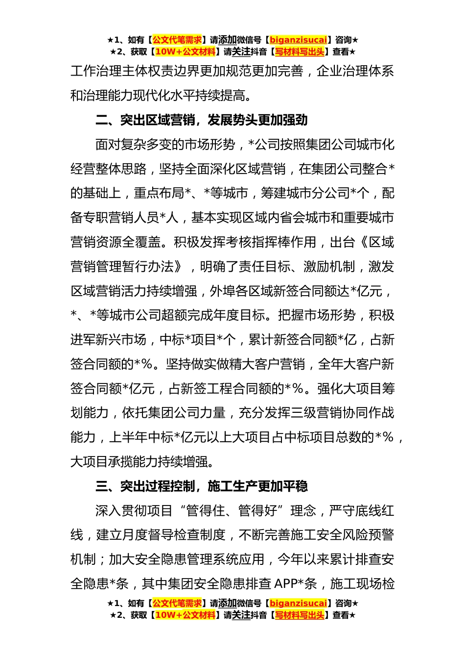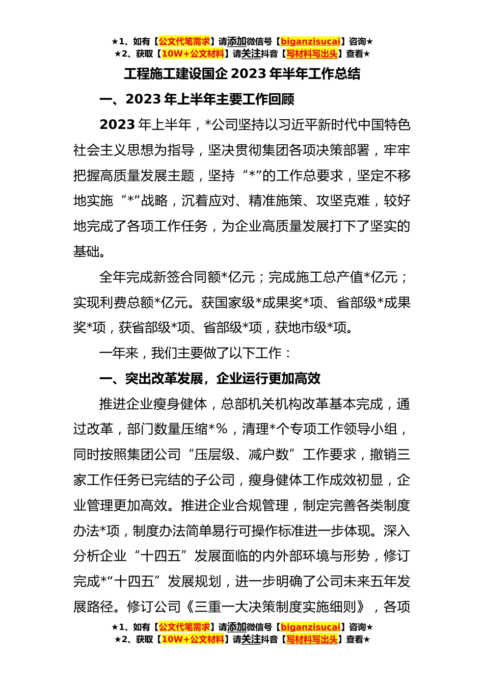 ★1、如有【公文代笔需求】请添加微信号【biganzisucai】咨询★★2、获取【10W+公文材料】请关注抖音【写材料写出头】查看★工程施工建设国企2023年半年工作总结一、2023年上半年主要工作回顾2023年上半年,*公司坚持以习近平新时代中国特色社会主义思想为指导,坚决贯彻集团各项决策部署,牢牢把握高质量发展主题,坚持“*”的工作总要求,坚定不移地实施“*”战略,沉着应对、精准施策、攻坚克难,较好地完成了各项工作任务,为企业高质量发展打下了坚实的基础。全年完成新签合同额*亿元;完成施工总产值*亿元;实现利费总额*亿元。获国家级*成果奖*项、省部级*成果奖*项,获省部级*项、省部级*项,获地市级*项。一年来,我们主要做了以下工作:一、突出改革发展,企业运行更加高效推进企业瘦身健体,总部机关机...