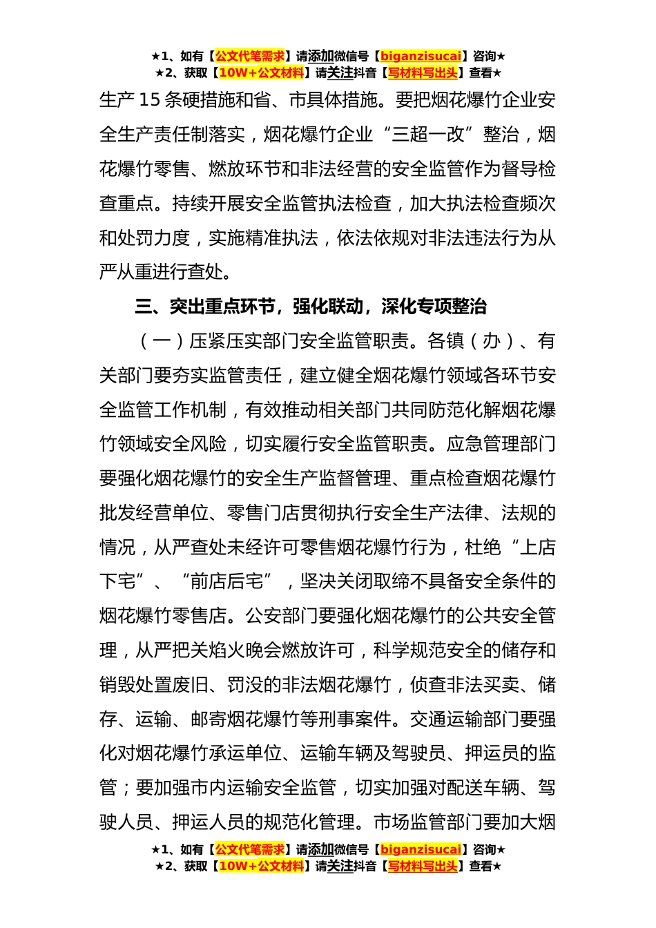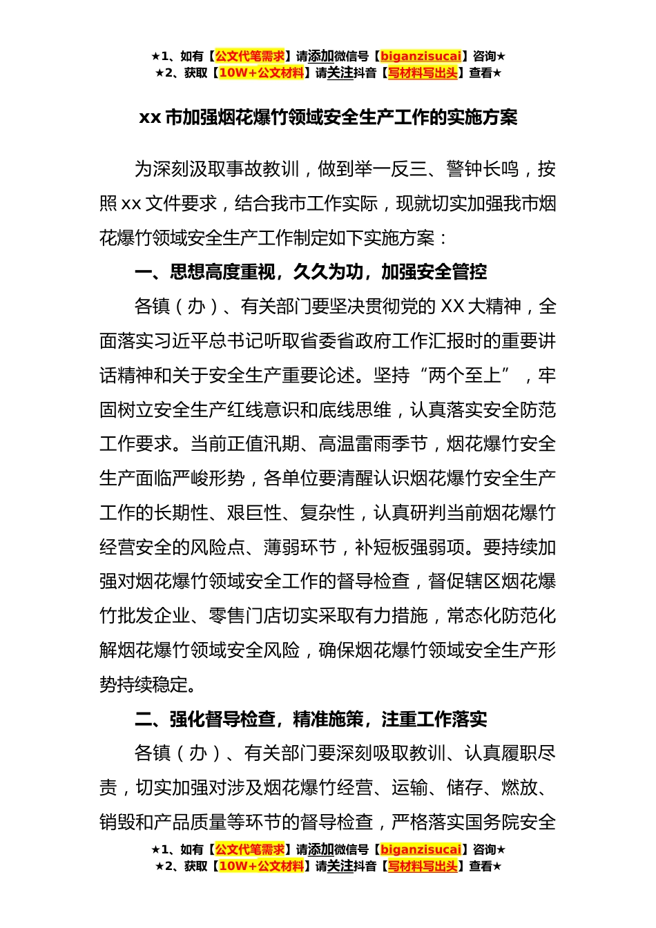 ★1、如有【公文代笔需求】请添加微信号【biganzisucai】咨询★★2、获取【10W+公文材料】请关注抖音【写材料写出头】查看★xx市加强烟花爆竹领域安全生产工作的实施方案为深刻汲取事故教训,做到举一反三、警钟长鸣,按照xx文件要求,结合我市工作实际,现就切实加强我市烟花爆竹领域安全生产工作制定如下实施方案:一、思想高度重视,久久为功,加强安全管控各镇(办)、有关部门要坚决贯彻党的XX大精神,全面落实习近平总书记听取省委省政府工作汇报时的重要讲话精神和关于安全生产重要论述。坚持“两个至上”,牢固树立安全生产红线意识和底线思维,认真落实安全防范工作要求。当前正值汛期、高温雷雨季节,烟花爆竹安全生产面临严峻形势,各单位要清醒认识烟花爆竹安全生产工作的长期性、艰巨性、复杂性,认...