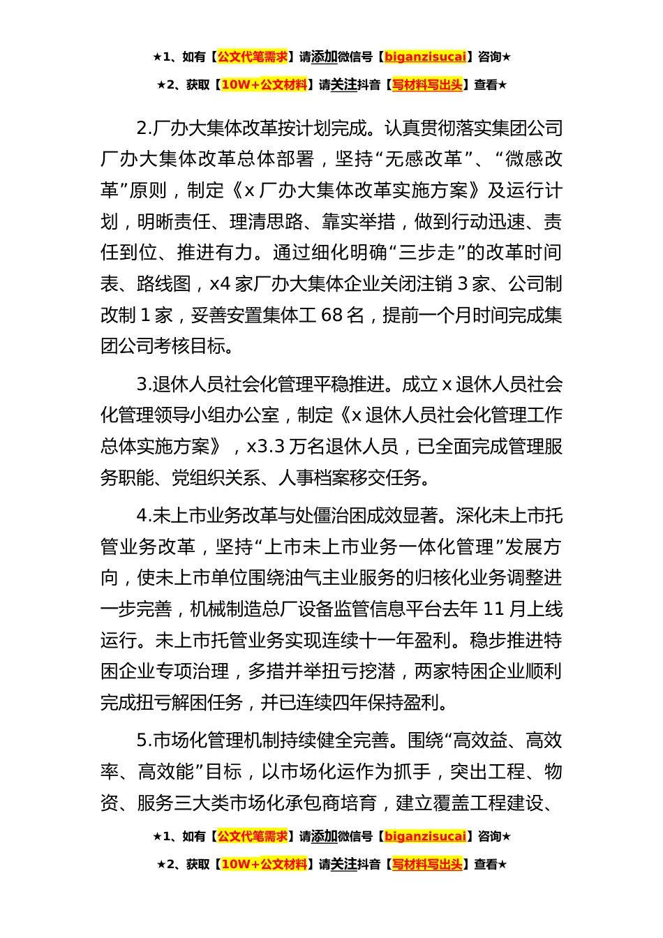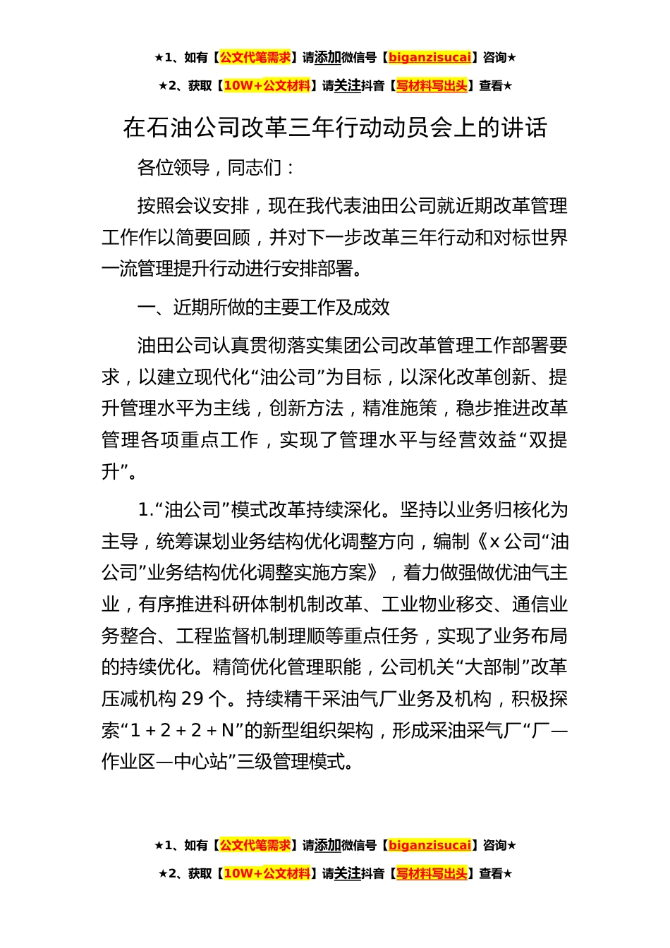 ★1、如有【公文代笔需求】请添加微信号【biganzisucai】咨询★★2、获取【10W+公文材料】请关注抖音【写材料写出头】查看★在石油公司改革三年行动动员会上的讲话各位领导,同志们:按照会议安排,现在我代表油田公司就近期改革管理工作作以简要回顾,并对下一步改革三年行动和对标世界一流管理提升行动进行安排部署。一、近期所做的主要工作及成效油田公司认真贯彻落实集团公司改革管理工作部署要“”求,以建立现代化油公司为目标,以深化改革创新、提升管理水平为主线,创新方法,精准施策,稳步推进改革“管理各项重点工作,实现了管理水平与经营效益双提”升。1.“”油公司模式改革持续深化。坚持以业务归核化为主导,统筹谋划业务结构优化调整方向,编制《x“公司油”公司业务结构优化调整实施方案》,着力...