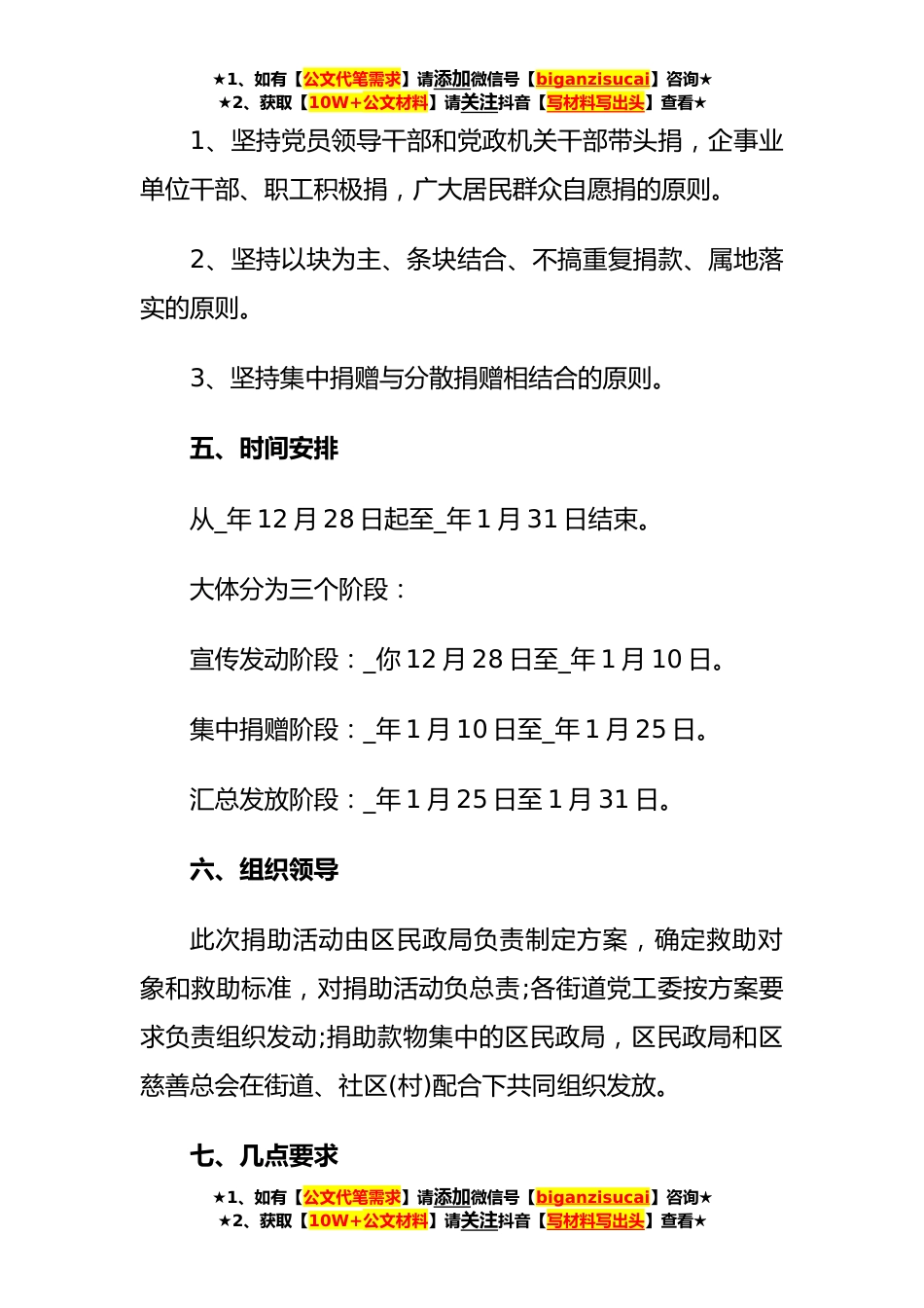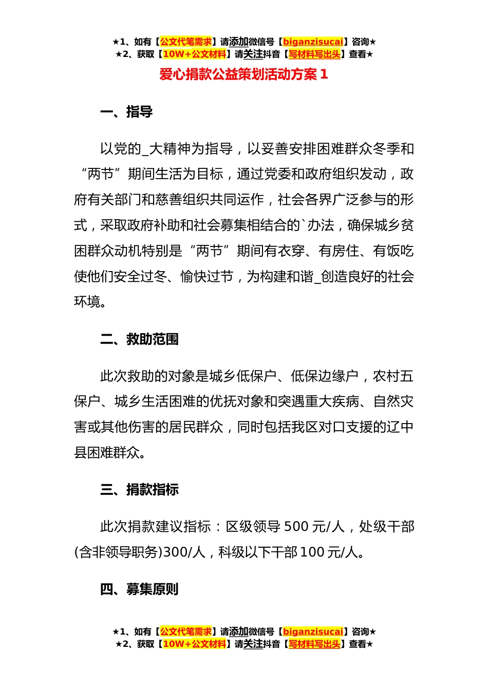 ★1、如有【公文代笔需求】请添加微信号【biganzisucai】咨询★★2、获取【10W+公文材料】请关注抖音【写材料写出头】查看★爱心捐款公益策划活动方案1一、指导以党的_大精神为指导,以妥善安排困难群众冬季和“两节”期间生活为目标,通过党委和政府组织发动,政府有关部门和慈善组织共同运作,社会各界广泛参与的形式,采取政府补助和社会募集相结合的`办法,确保城乡贫困群众动机特别是“两节”期间有衣穿、有房住、有饭吃使他们安全过冬、愉快过节,为构建和谐_创造良好的社会环境。二、救助范围此次救助的对象是城乡低保户、低保边缘户,农村五保户、城乡生活困难的优抚对象和突遇重大疾病、自然灾害或其他伤害的居民群众,同时包括我区对口支援的辽中县困难群众。三、捐款指标此次捐款建议指标:区级领导500...