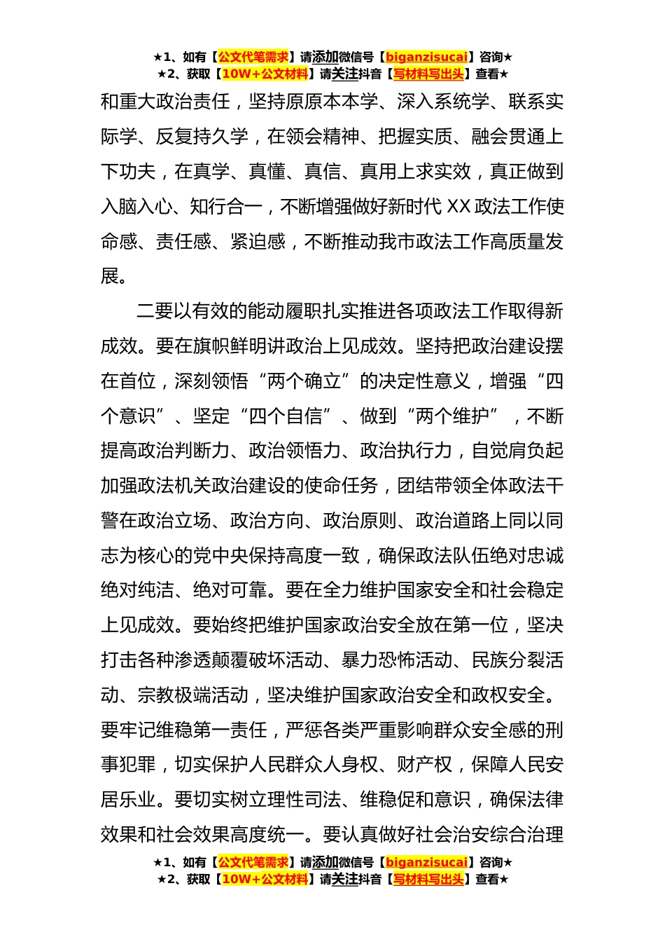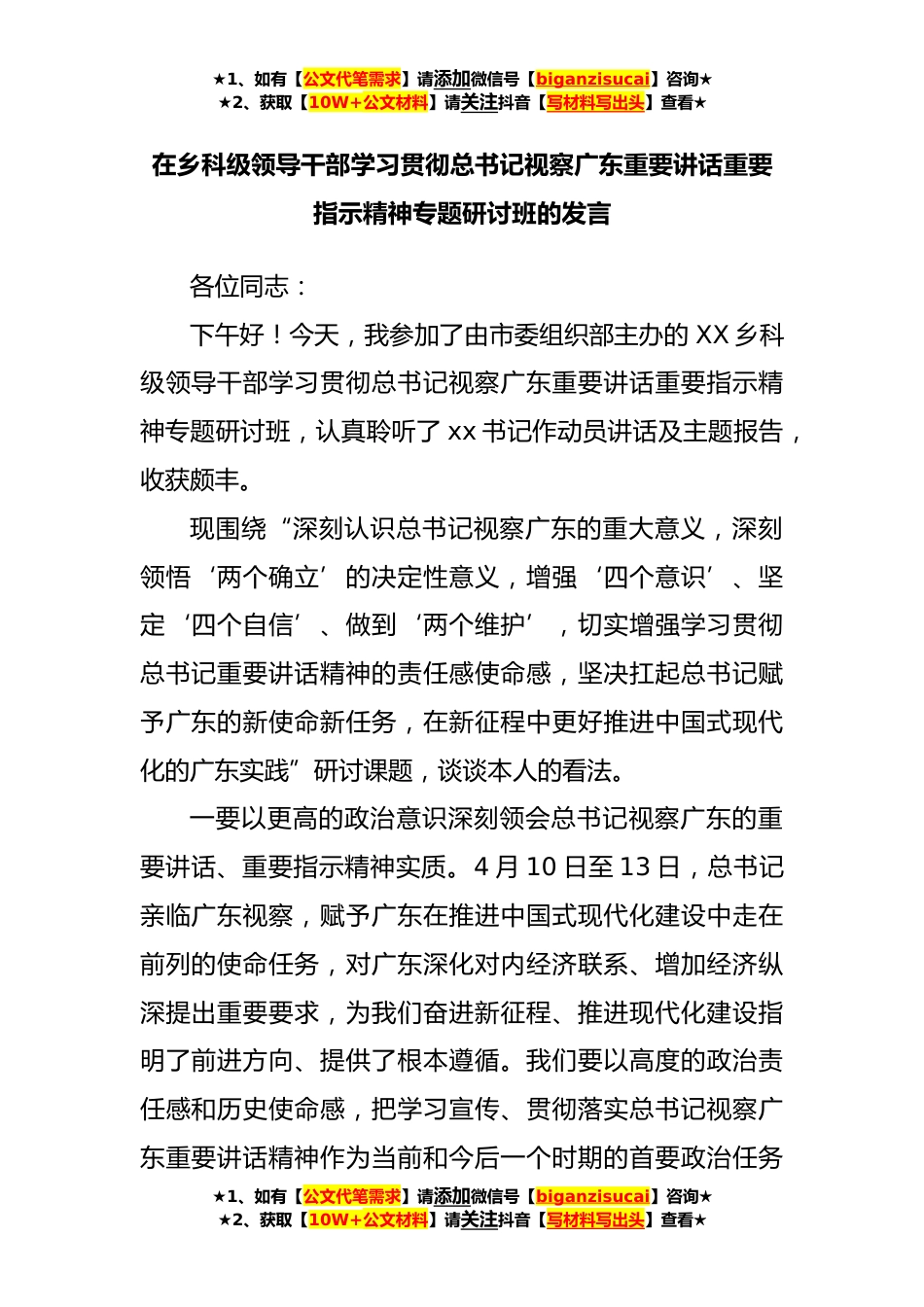 ★1、如有【公文代笔需求】请添加微信号【biganzisucai】咨询★★2、获取【10W+公文材料】请关注抖音【写材料写出头】查看★在乡科级领导干部学习贯彻总书记视察广东重要讲话重要指示精神专题研讨班的发言各位同志:下午好!今天,我参加了由市委组织部主办的XX乡科级领导干部学习贯彻总书记视察广东重要讲话重要指示精神专题研讨班,认真聆听了xx书记作动员讲话及主题报告,收获颇丰。现围绕“深刻认识总书记视察广东的重大意义,深刻领悟‘两个确立’的决定性意义,增强‘四个意识’、坚定‘四个自信’、做到‘两个维护’,切实增强学习贯彻总书记重要讲话精神的责任感使命感,坚决扛起总书记赋予广东的新使命新任务,在新征程中更好推进中国式现代化的广东实践”研讨课题,谈谈本人的看法。一要以更高的政治意...