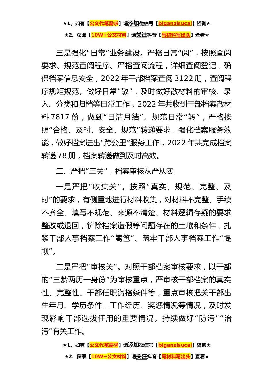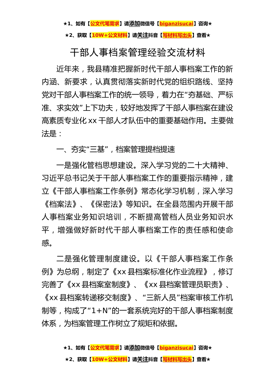 ★1、如有【公文代笔需求】请添加微信号【biganzisucai】咨询★★2、获取【10W+公文材料】请关注抖音【写材料写出头】查看★干部人事档案管理经验交流材料近年来,我县精准把握新时代干部人事档案工作的新内涵、新要求,认真贯彻落实新时代党的组织路线、坚持“党对干部人事档案工作的统一领导,着力在夯基础、严标”准、求实效上下功夫,较好地发挥了干部人事档案在建设高素质专业化xx干部人才队伍中的重要基础作用。主要做法是:“”一、夯实三基,档案管理提档提速一是强化管档思想建设。深入学习党的二十大精神、习近平总书记关于干部人事档案工作的重要指示精神,建立《干部人事档案工作条例》常态化学习机制,深入学习《档案法》、《保密法》等知识。在全县范围内开展干部人事档案业务知识培训,不断提高管...