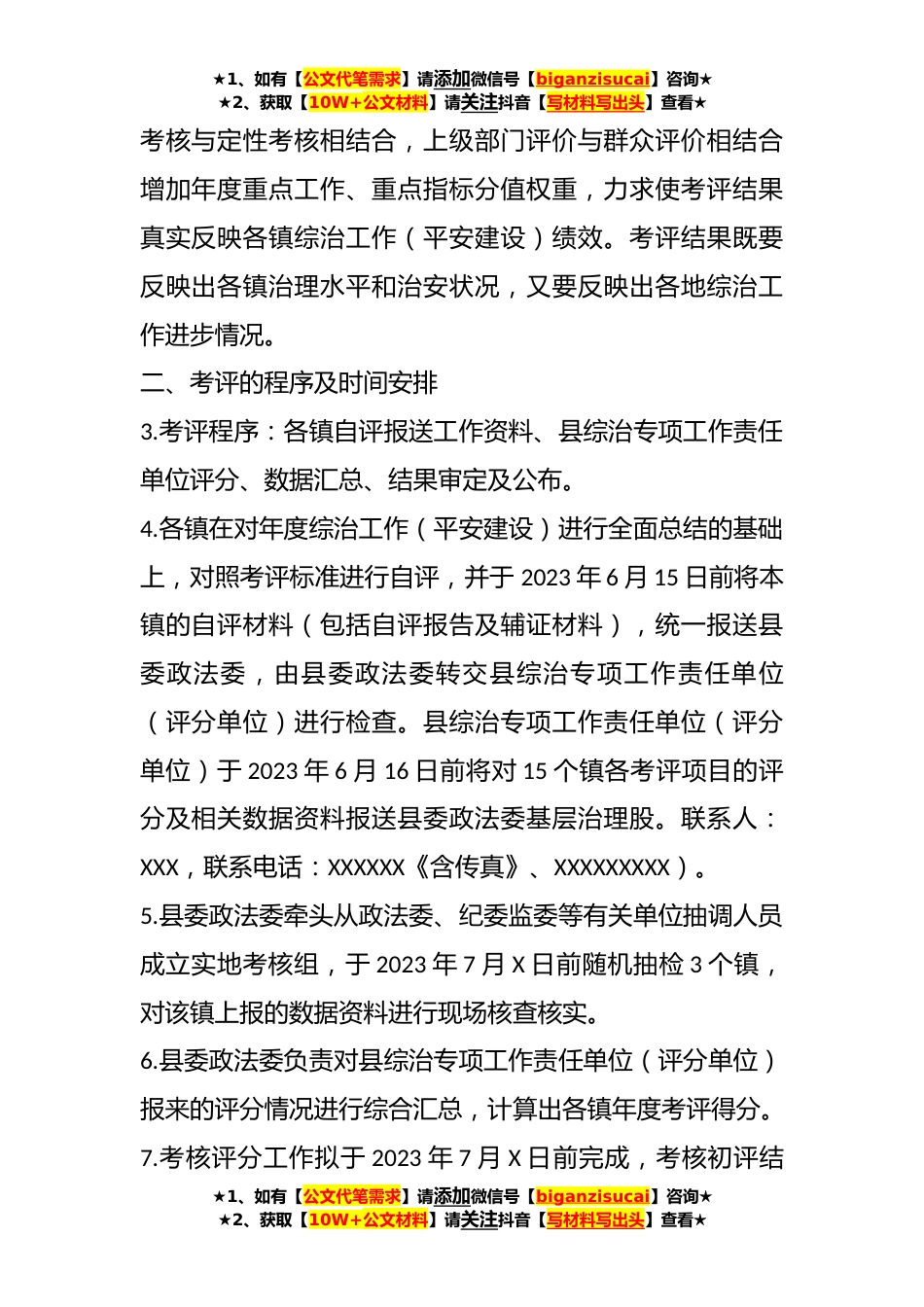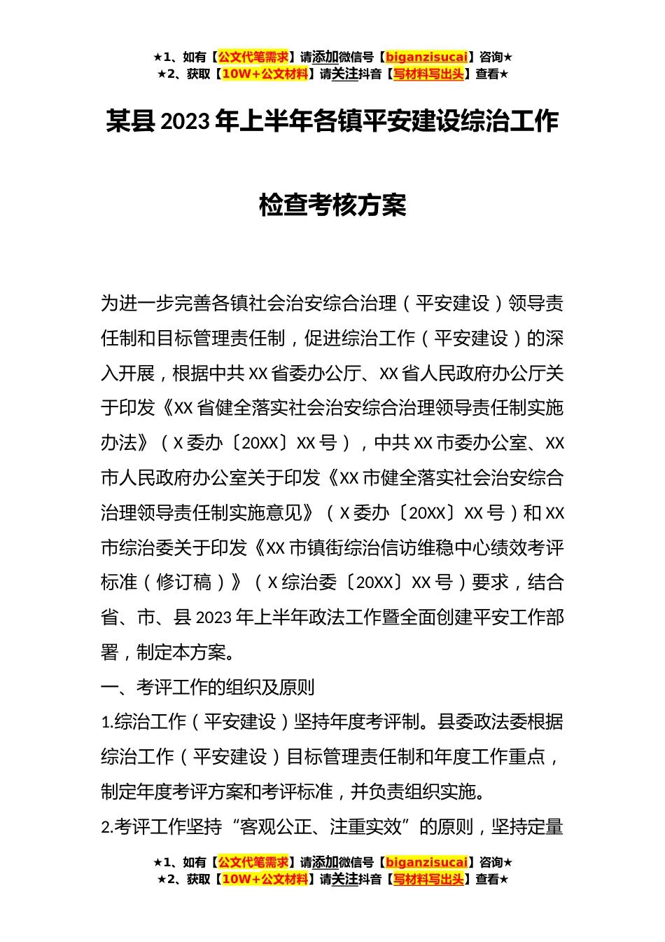★1、如有【公文代笔需求】请添加微信号【biganzisucai】咨询★★2、获取【10W+公文材料】请关注抖音【写材料写出头】查看★某县2023年上半年各镇平安建设综治工作检查考核方案为进一步完善各镇社会治安综合治理(平安建设)领导责任制和目标管理责任制,促进综治工作(平安建设)的深入开展,根据中共XX省委办公厅、XX省人民政府办公厅关于印发《XX省健全落实社会治安综合治理领导责任制实施办法》(X委办〔20XX〕XX号),中共XX市委办公室、XX市人民政府办公室关于印发《XX市健全落实社会治安综合治理领导责任制实施意见》(X委办〔20XX〕XX号)和XX市综治委关于印发《XX市镇街综治信访维稳中心绩效考评标准(修订稿)》(X综治委〔20XX〕XX号)要求,结合省、市、县2023年上半年政法工作暨全面创建平安工作部署...