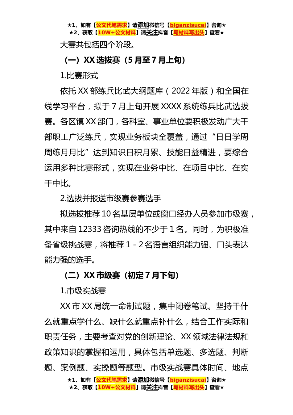 ★1、如有【公文代笔需求】请添加微信号【biganzisucai】咨询★★2、获取【10W+公文材料】请关注抖音【写材料写出头】查看★2023年度XX系统“永远跟党走建功新时代”练兵比武大赛实施方案一、指导思想坚持以习近平新时代中国特色社会主义思想为指导,深入贯彻落实党的XX大精神,围绕练队伍、树标兵、建标准、促改革、提质效,以赛促学、以赛添智、以赛强能、以赛增干,大力提升XX干部队伍的政治素养、履职能力和业务水平,培育培树一批善为、敢为、能为的XX干部,为全面推进中国式现代化XX新实践贡献XX智慧和力量。二、大赛主题永远跟党走建功新时代三、参与对象全市XX系统干部职工四、活动内容聚焦群众之盼、改革之难、发展之需,自觉运用党的创新理论研究新情况、解决新问题、总结新经验、探索新规律。具体内容...