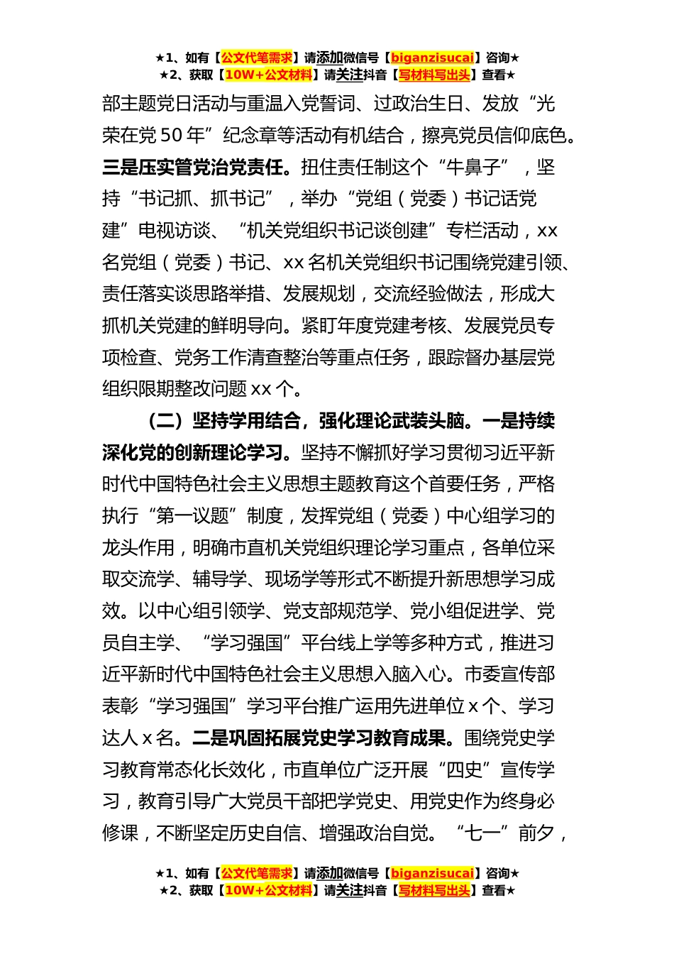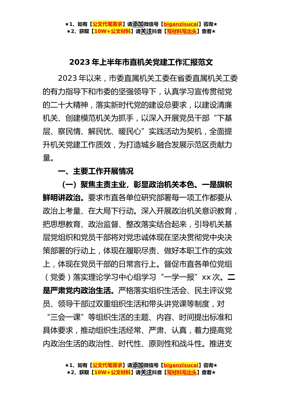 ★1、如有【公文代笔需求】请添加微信号【biganzisucai】咨询★★2、获取【10W+公文材料】请关注抖音【写材料写出头】查看★2023年上半年市直机关党建工作汇报范文2023年以来,市委直属机关工委在省委直属机关工委的有力指导下和市委的坚强领导下,认真学习宣传贯彻党的二十大精神,落实新时代党的建设总要求,以建设清廉机关、创建模范机关为抓手,以深入开展党员干部“下基层、察民情、解民忧、暖民心”实践活动为契机,全面提升机关党建工作质效,为打造城乡融合发展示范区贡献力量。一、主要工作开展情况(一)聚焦主责主业,彰显政治机关本色。一是旗帜鲜明讲政治。要求市直各单位研究部署每一项工作都要从政治上考量、在大局下行动。深入开展政治机关意识教育,把思想教育、政治监督、整改落实结合起来,引...