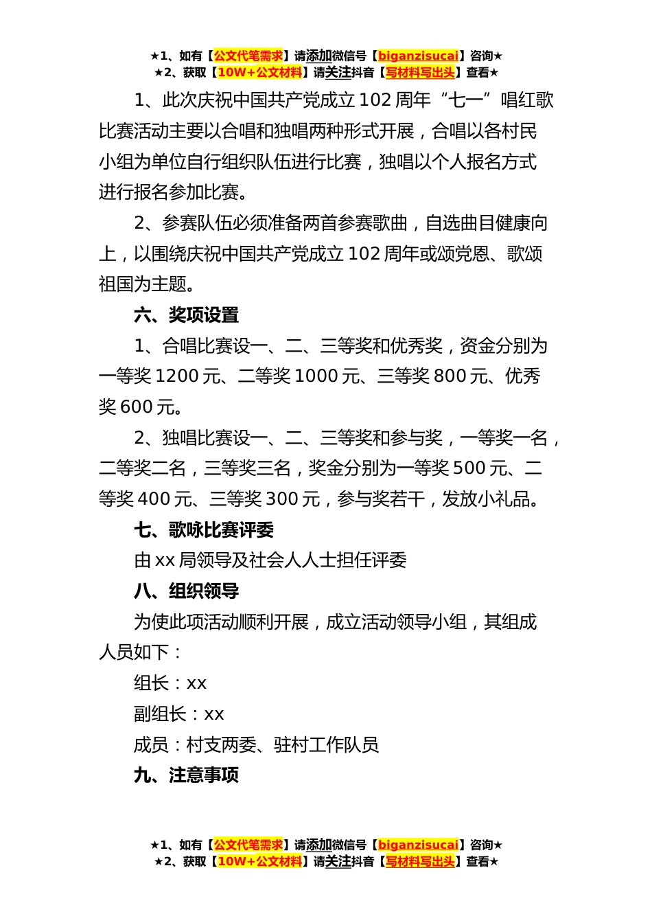 ★1、如有【公文代笔需求】请添加微信号【biganzisucai】咨询★★2、获取【10W+公文材料】请关注抖音【写材料写出头】查看★x村“七一”建党节红歌比赛活动方案范文为了庆祝中国共产党成立102周年,持续推进学习贯彻习近平新时代中国特色社会主义思想主题教育,x村党支部开展“唱红歌、颂党恩、抒情怀、强素质”为主题的红歌比赛活动,丰富人民群众精神文化生活,向党致敬、为英雄歌唱,用歌声放飞梦想,用歌声唱出心中激情,加强人民群众的爱国主义热情,弘扬中华民族的传统民族精神,让广大群众熟知今天的幸福生活来之不易,从而充分发挥革命先烈的吃苦耐劳精神,为社会主义建设添砖加瓦。现结合我村实际情况,制定本次庆祝中国共产党成立102周年“七一”唱红歌比赛活动方案。一、活动时间2023年7月1日二、活动...
