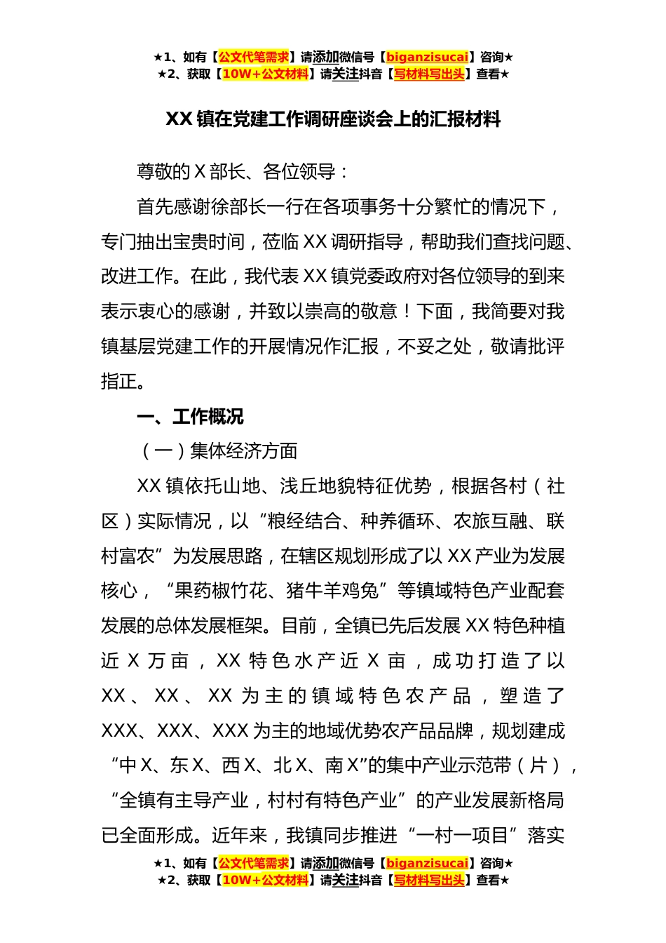★1、如有【公文代笔需求】请添加微信号【biganzisucai】咨询★★2、获取【10W+公文材料】请关注抖音【写材料写出头】查看★XX镇在党建工作调研座谈会上的汇报材料尊敬的X部长、各位领导:首先感谢徐部长一行在各项事务十分繁忙的情况下,专门抽出宝贵时间,莅临XX调研指导,帮助我们查找问题、改进工作。在此,我代表XX镇党委政府对各位领导的到来表示衷心的感谢,并致以崇高的敬意!下面,我简要对我镇基层党建工作的开展情况作汇报,不妥之处,敬请批评指正。一、工作概况(一)集体经济方面XX镇依托山地、浅丘地貌特征优势,根据各村(社区)实际情况,以“粮经结合、种养循环、农旅互融、联村富农”为发展思路,在辖区规划形成了以XX产业为发展核心,“果药椒竹花、猪牛羊鸡兔”等镇域特色产业配套发展的总体...
