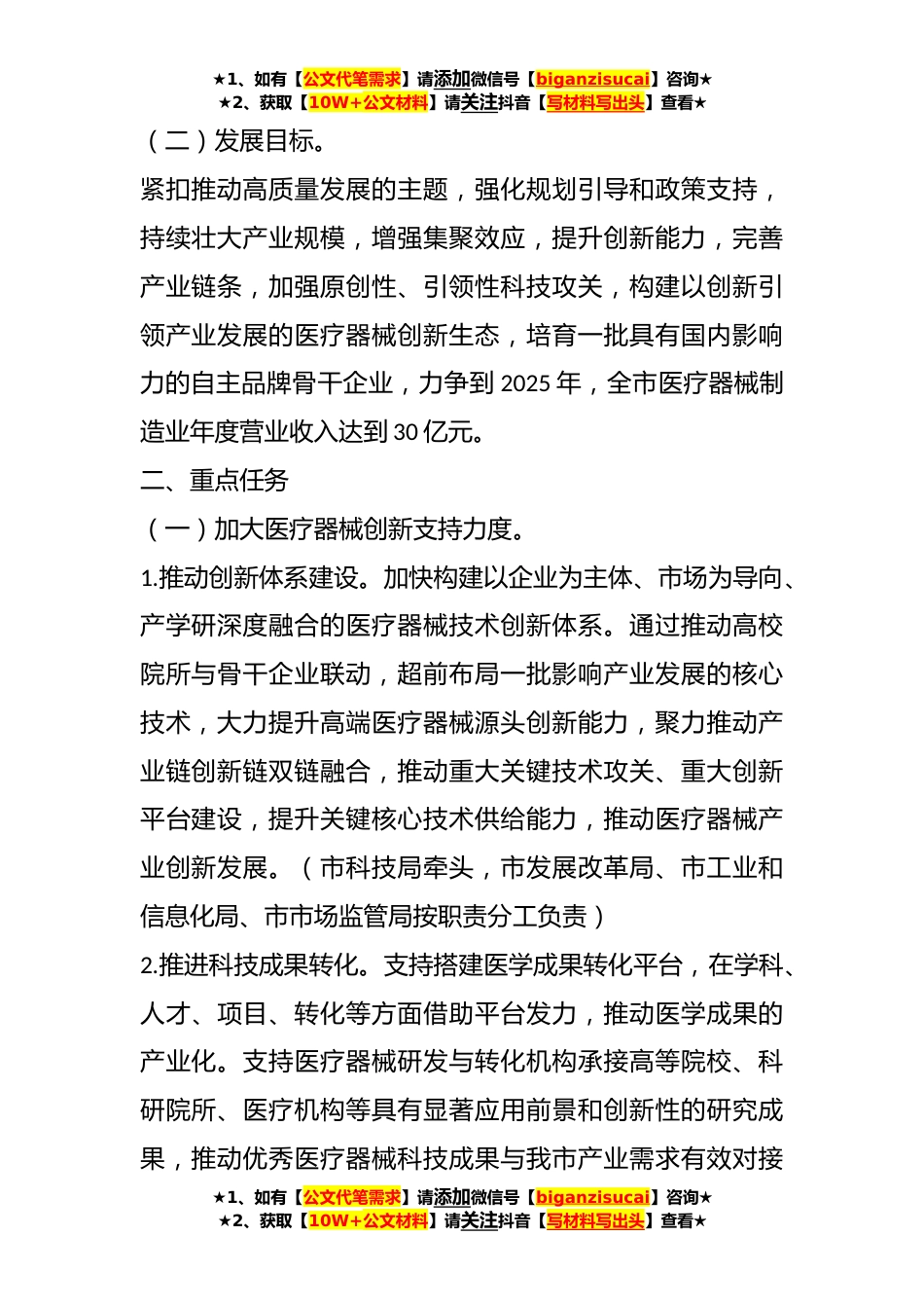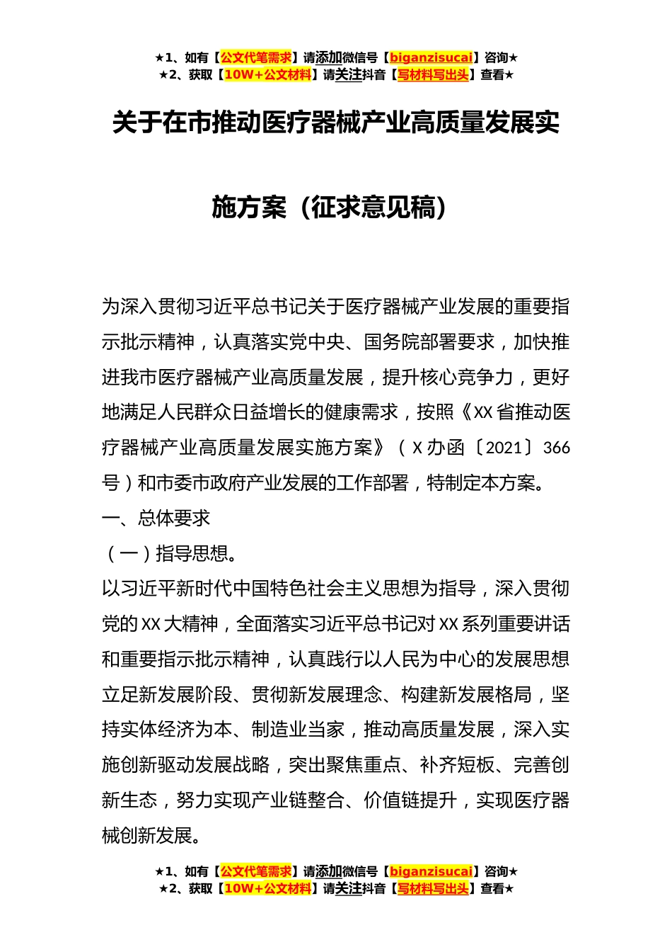 ★1、如有【公文代笔需求】请添加微信号【biganzisucai】咨询★★2、获取【10W+公文材料】请关注抖音【写材料写出头】查看★关于在市推动医疗器械产业高质量发展实施方案(征求意见稿)为深入贯彻习近平总书记关于医疗器械产业发展的重要指示批示精神,认真落实党中央、国务院部署要求,加快推进我市医疗器械产业高质量发展,提升核心竞争力,更好地满足人民群众日益增长的健康需求,按照《XX省推动医疗器械产业高质量发展实施方案》(X办函〔2021〕366号)和市委市政府产业发展的工作部署,特制定本方案。一、总体要求(一)指导思想。以习近平新时代中国特色社会主义思想为指导,深入贯彻党的XX大精神,全面落实习近平总书记对XX系列重要讲话和重要指示批示精神,认真践行以人民为中心的发展思想立足新发展阶段...