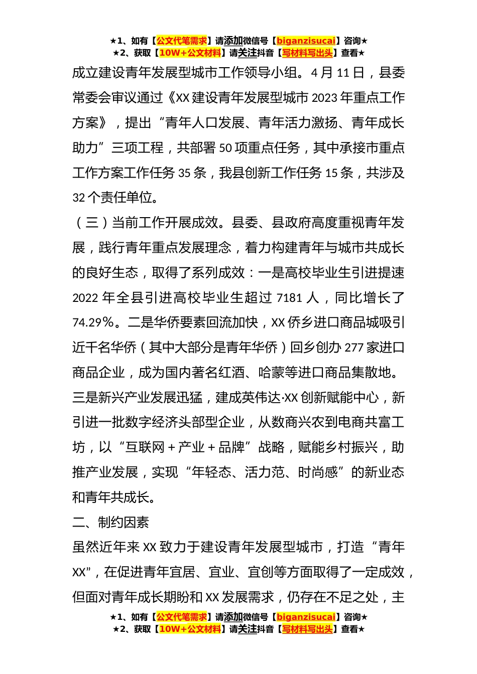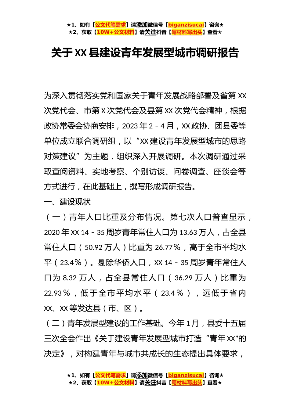 ★1、如有【公文代笔需求】请添加微信号【biganzisucai】咨询★★2、获取【10W+公文材料】请关注抖音【写材料写出头】查看★关于XX县建设青年发展型城市调研报告为深入贯彻落实党和国家关于青年发展战略部署及省第XX次党代会、市第X次党代会及县第XX次党代会精神,根据政协常委会协商安排,2023年2-4月,XX政协、团县委等单位成立联合调研组,以“XX建设青年发展型城市的思路对策建议”为主题,组织深入开展调研。本次调研通过采取查阅资料、实地考察、个别访谈、问卷调查、座谈会等方式进行,在此基础上,撰写形成调研报告。一、建设现状(一)青年人口比重及分布情况。第七次人口普查显示,2020年XX14-35周岁青年常住人口为13.63万人,占全县常住人口(50.92万人)比重为26.77%,高于全市平均水平(23.4%)...
