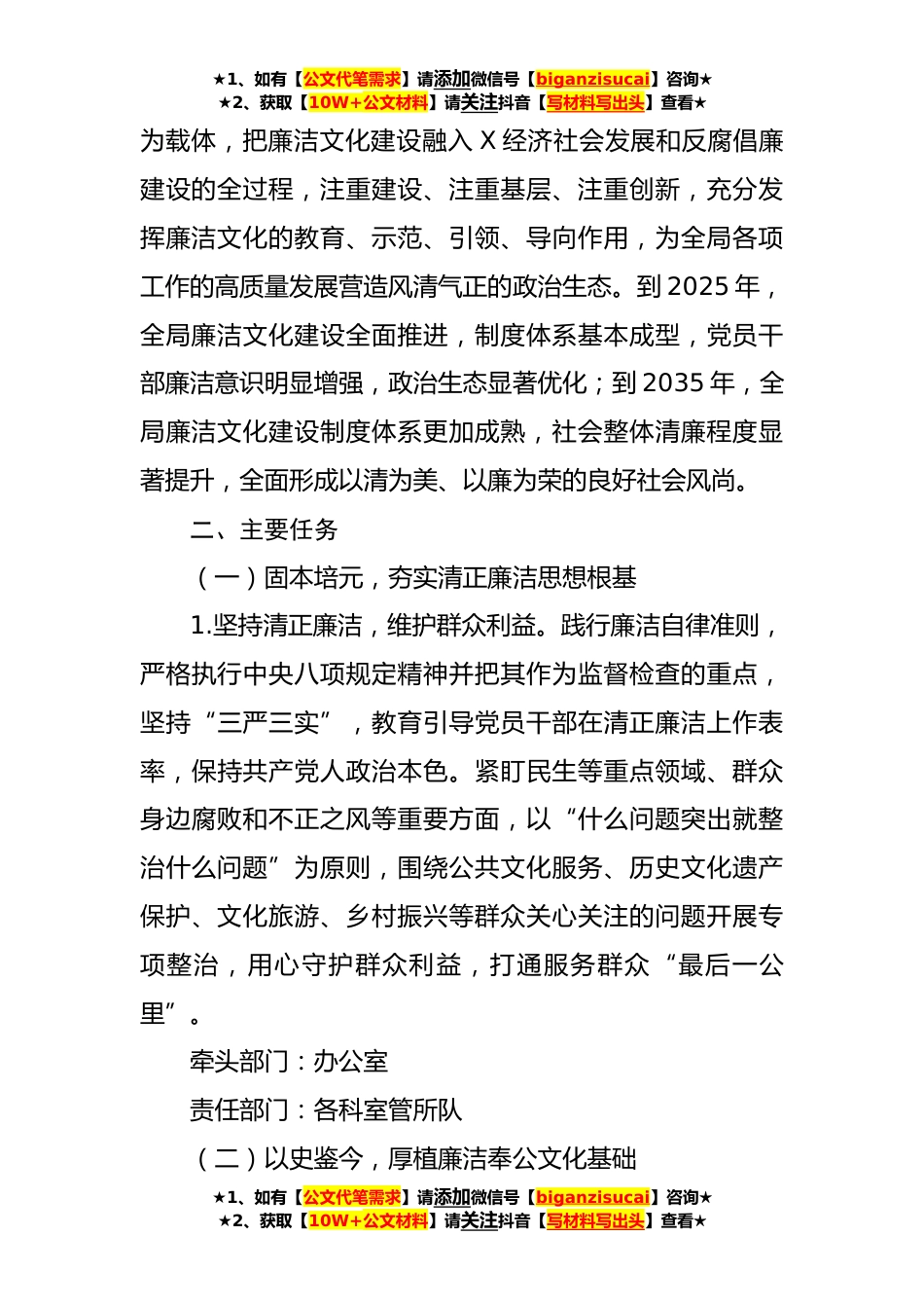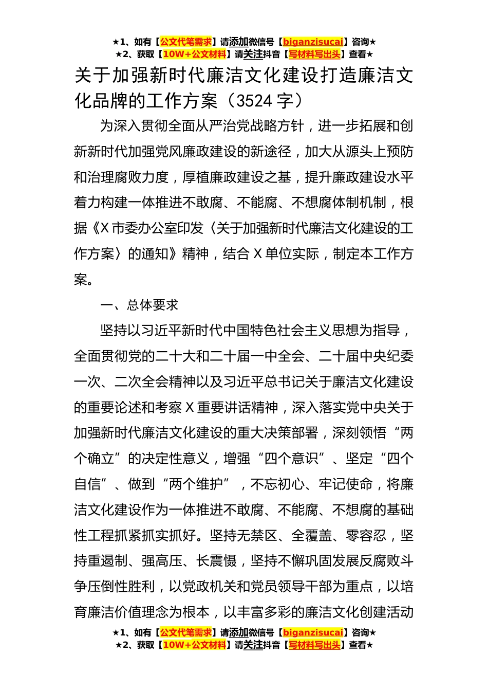 ★1、如有【公文代笔需求】请添加微信号【biganzisucai】咨询★★2、获取【10W+公文材料】请关注抖音【写材料写出头】查看★关于加强新时代廉洁文化建设打造廉洁文化品牌的工作方案(3524字)为深入贯彻全面从严治党战略方针,进一步拓展和创新新时代加强党风廉政建设的新途径,加大从源头上预防和治理腐败力度,厚植廉政建设之基,提升廉政建设水平着力构建一体推进不敢腐、不能腐、不想腐体制机制,根据《X市委办公室印发〈关于加强新时代廉洁文化建设的工作方案〉的通知》精神,结合X单位实际,制定本工作方案。一、总体要求坚持以习近平新时代中国特色社会主义思想为指导,全面贯彻党的二十大和二十届一中全会、二十届中央纪委一次、二次全会精神以及习近平总书记关于廉洁文化建设的重要论述和考察X重要讲话精...