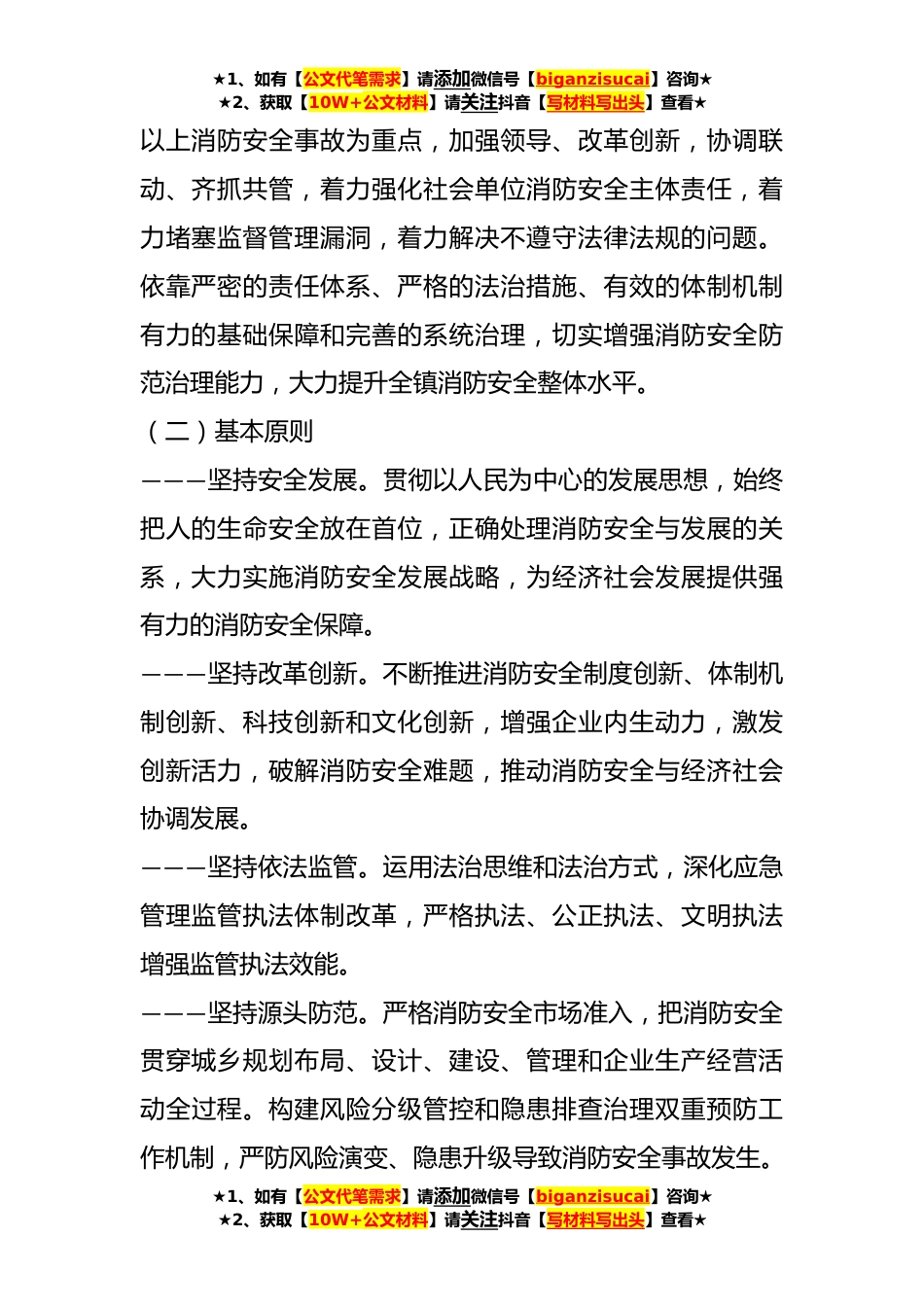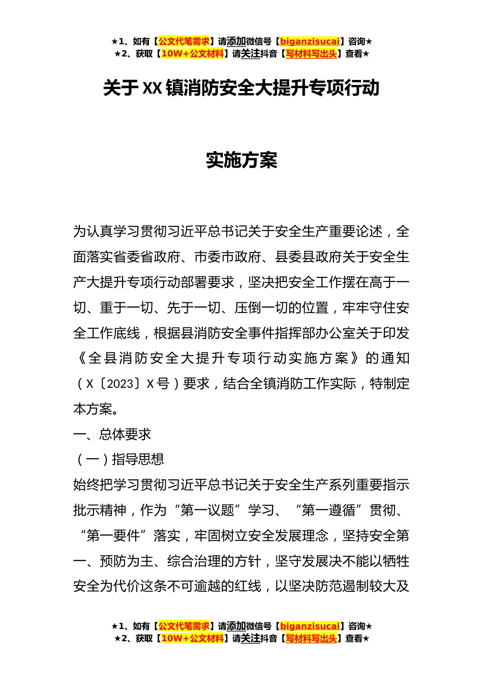★1、如有【公文代笔需求】请添加微信号【biganzisucai】咨询★★2、获取【10W+公文材料】请关注抖音【写材料写出头】查看★关于XX镇消防安全大提升专项行动实施方案为认真学习贯彻习近平总书记关于安全生产重要论述,全面落实省委省政府、市委市政府、县委县政府关于安全生产大提升专项行动部署要求,坚决把安全工作摆在高于一切、重于一切、先于一切、压倒一切的位置,牢牢守住安全工作底线,根据县消防安全事件指挥部办公室关于印发《全县消防安全大提升专项行动实施方案》的通知(X〔2023〕X号)要求,结合全镇消防工作实际,特制定本方案。一、总体要求(一)指导思想始终把学习贯彻习近平总书记关于安全生产系列重要指示批示精神,作为“第一议题”学习、“第一遵循”贯彻、“第一要件”落实,牢固树立安全...