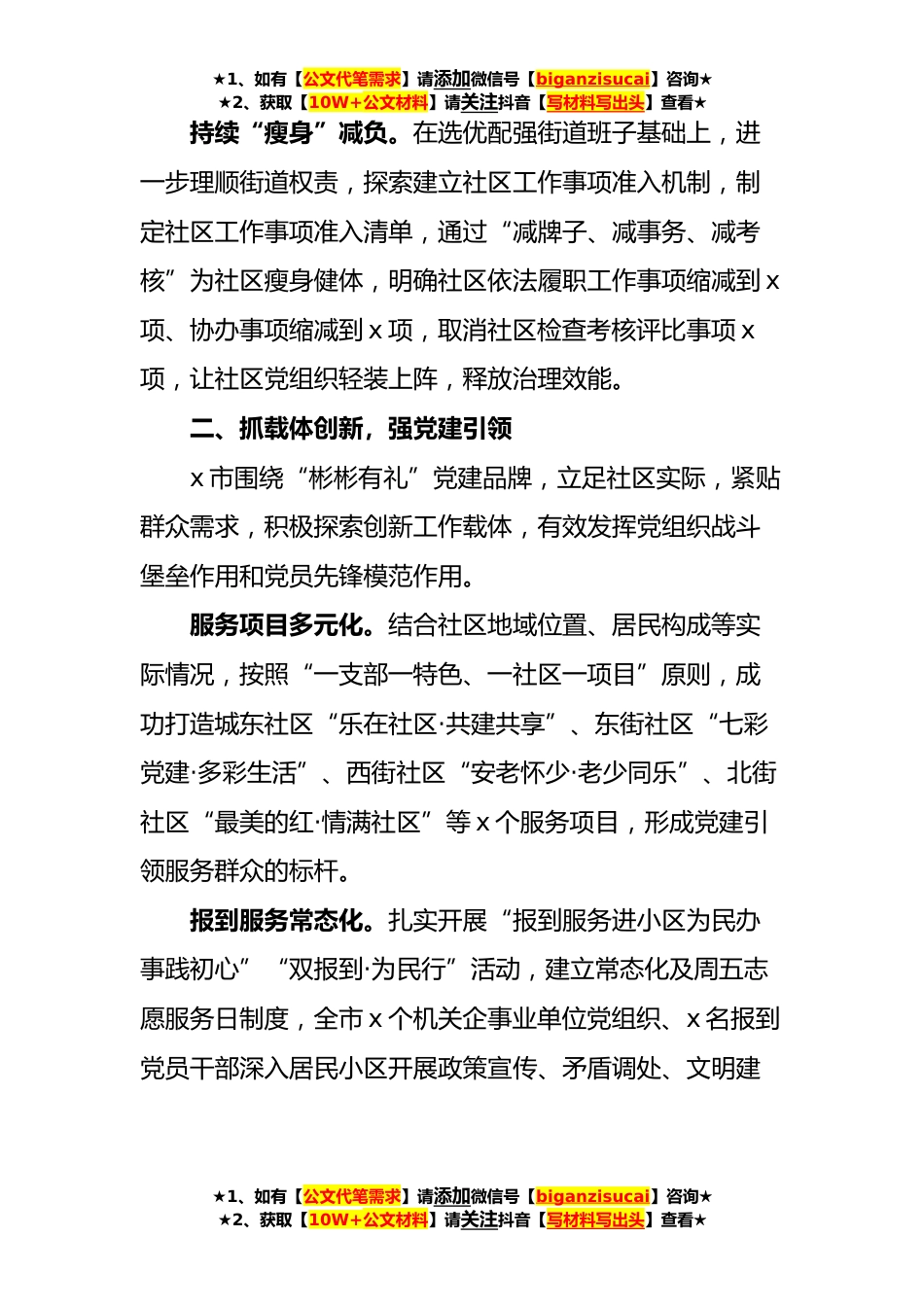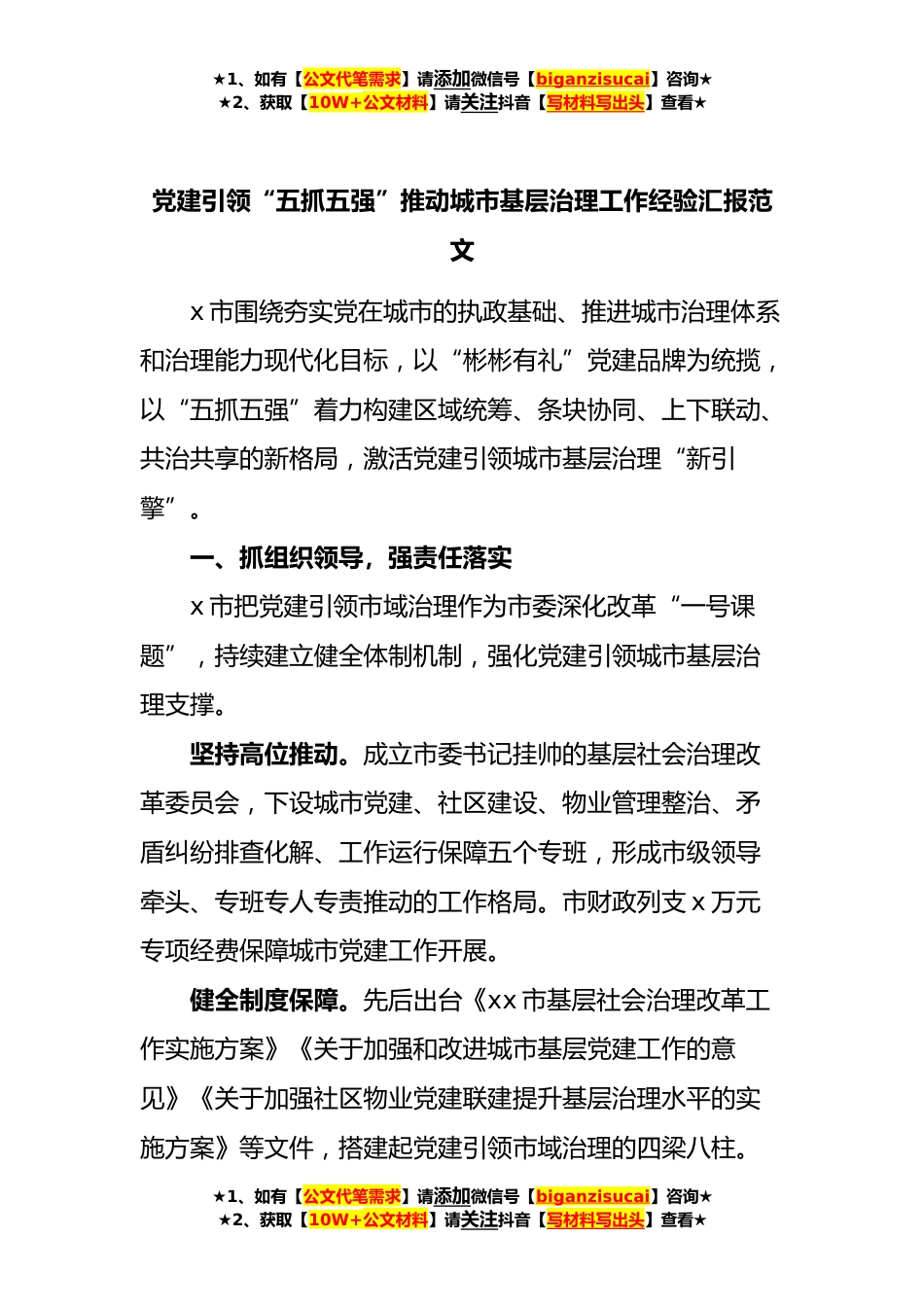 ★1、如有【公文代笔需求】请添加微信号【biganzisucai】咨询★★2、获取【10W+公文材料】请关注抖音【写材料写出头】查看★党建引领“五抓五强”推动城市基层治理工作经验汇报范文x市围绕夯实党在城市的执政基础、推进城市治理体系和治理能力现代化目标,以“彬彬有礼”党建品牌为统揽,以“五抓五强”着力构建区域统筹、条块协同、上下联动、共治共享的新格局,激活党建引领城市基层治理“新引擎”。一、抓组织领导,强责任落实x市把党建引领市域治理作为市委深化改革“一号课题”,持续建立健全体制机制,强化党建引领城市基层治理支撑。坚持高位推动。成立市委书记挂帅的基层社会治理改革委员会,下设城市党建、社区建设、物业管理整治、矛盾纠纷排查化解、工作运行保障五个专班,形成市级领导牵头、专班专人...