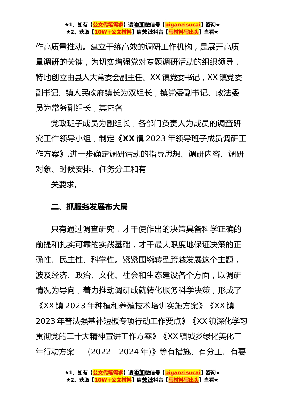 ★1、如有【公文代笔需求】请添加微信号【biganzisucai】咨询★★2、获取【10W+公文材料】请关注抖音【写材料写出头】查看★2023关于大兴调查研究工作展开情况总结报告(2篇)(一)XX镇仔细贯彻中共中央办公厅印发的《关于在全党大兴调查研究的工作方案》及中共XX省委办公厅印发的《关于在全省大兴调查研究的实施方案》精神,学习贯彻党的二十大精神,深化贯彻落实习近平总书记关于调查研究工作的重要阐述精神,立足工作实际,主动构建“大调研”格局,围绕乡村振兴、优化营商环境、经济发展、绿化美化等工作,细心组织展开专题调研活动,大兴调查研究之风,以高质量调研成就为科学决策供应基础性数据支撑,狠抓各项工作落地奏效。一、抓策划定基调调查研究是谋事之基、成事之道。XX镇全面贯彻中央、省委、市委、县...