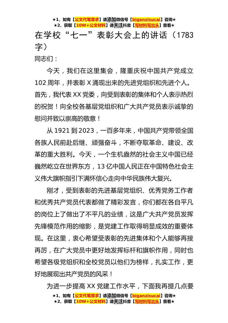 ★1、如有【公文代笔需求】请添加微信号【biganzisucai】咨询★★2、获取【10W+公文材料】请关注抖音【写材料写出头】查看★在学校“七一”表彰大会上的讲话(1783字)同志们:今天,我们在这里集会,隆重庆祝中国共产党成立102周年,并表彰X涌现出来的先进党组织和先进个人。首先,我代表XX党委,向受到表彰的集体和个人表示热烈的祝贺!向全校各基层党组织和广大共产党员表示诚挚的慰问并致以崇高的敬意!从1921到2023,一百多年来,中国共产党带领全国各族人民前赴后继、顽强奋斗,不断夺取革命、建设、改革的重大胜利。今天,一个生机盎然的社会主义中国已经巍然屹立在世界东方,13亿中国人民正在中国特色社会主义伟大旗帜指引下满怀信心走向中华民族伟大复兴。刚才,受到表彰的先进基层党组织、优秀党务工作...