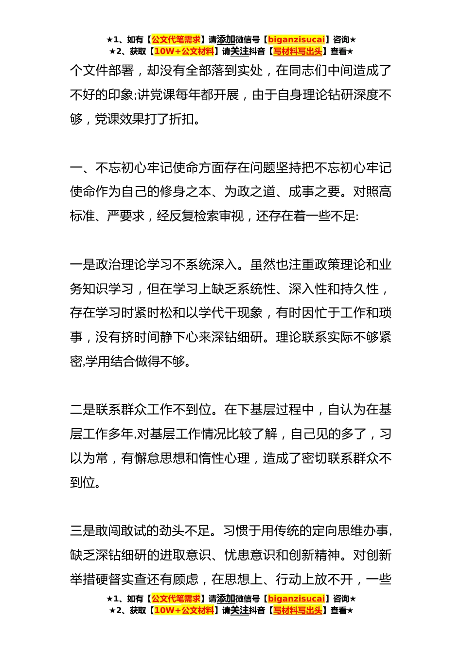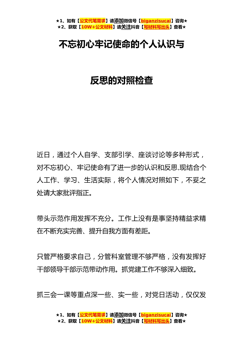 ★1、如有【公文代笔需求】请添加微信号【biganzisucai】咨询★★2、获取【10W+公文材料】请关注抖音【写材料写出头】查看★不忘初心牢记使命的个人认识与反思的对照检查近日,通过个人自学、支部引学、座谈讨论等多种形式,对不忘初心、牢记使命有了进一步的认识和反思,现结合个人工作、学习、生活实际,将个人情况对照如下,不妥之处请大家批评指正。带头示范作用发挥不充分。工作上没有是事坚持精益求精在不断充实完善、提升自我方面有差距。只管严格要求自己,分管科室管理不够严格,没有发挥好干部领导干部示范带动作用。抓党建工作不够深入细致。抓三会一课等重点深一些、实一些,对党日活动,仅仅发★1、如有【公文代笔需求】请添加微信号【biganzisucai】咨询★★2、获取【10W+公文材料】请关注抖音【写材...