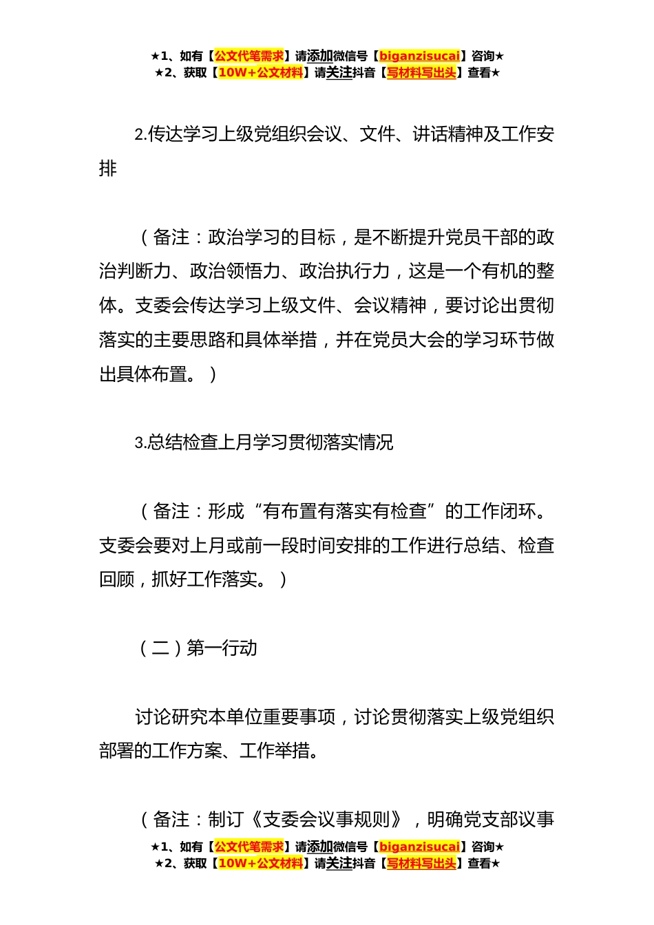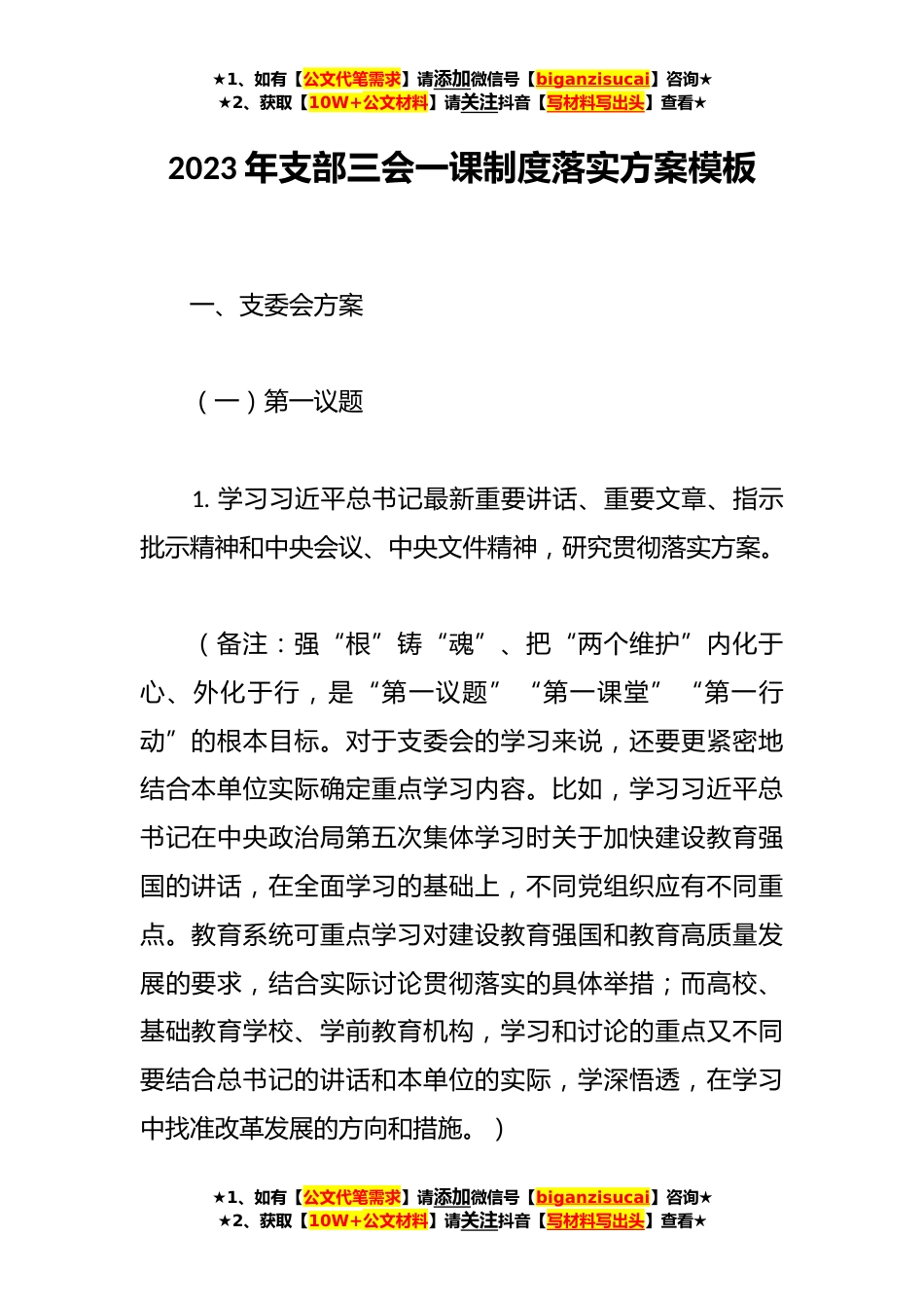 ★1、如有【公文代笔需求】请添加微信号【biganzisucai】咨询★★2、获取【10W+公文材料】请关注抖音【写材料写出头】查看★2023年支部三会一课制度落实方案模板一、支委会方案(一)第一议题1.学习习近平总书记最新重要讲话、重要文章、指示批示精神和中央会议、中央文件精神,研究贯彻落实方案。(备注:强“根”铸“魂”、把“两个维护”内化于心、外化于行,是“第一议题”“第一课堂”“第一行动”的根本目标。对于支委会的学习来说,还要更紧密地结合本单位实际确定重点学习内容。比如,学习习近平总书记在中央政治局第五次集体学习时关于加快建设教育强国的讲话,在全面学习的基础上,不同党组织应有不同重点。教育系统可重点学习对建设教育强国和教育高质量发展的要求,结合实际讨论贯彻落实的具体举措;...