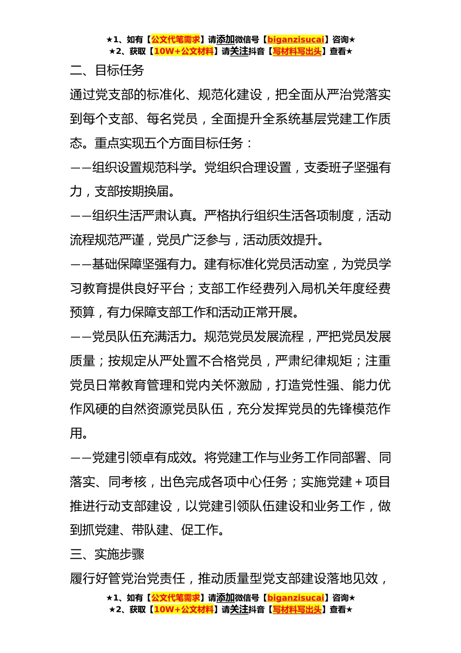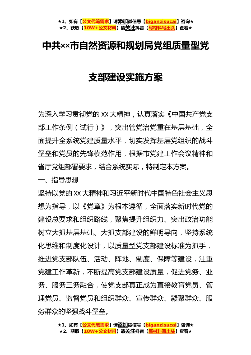 ★1、如有【公文代笔需求】请添加微信号【biganzisucai】咨询★★2、获取【10W+公文材料】请关注抖音【写材料写出头】查看★中共××市自然资源和规划局党组质量型党支部建设实施方案为深入学习贯彻党的XX大精神,认真落实《中国共产党支部工作条例(试行)》,突出管党治党重在基层基础,全面提升全系统党建质量水平,切实发挥基层党组织的战斗堡垒和党员的先锋模范作用,根据市党建工作会议精神和省厅党组部署要求,结合系统实际,特制定本方案。一、指导思想坚持以党的XX大精神和习近平新时代中国特色社会主义思想为指导,以《党章》为根本遵循,全面落实新时代党的建设总要求和组织路线,聚焦提升组织力、突出政治功能树立大抓基层基础、大抓支部建设的鲜明导向,坚持系统化思维和制度化设计,以质量型党支部...