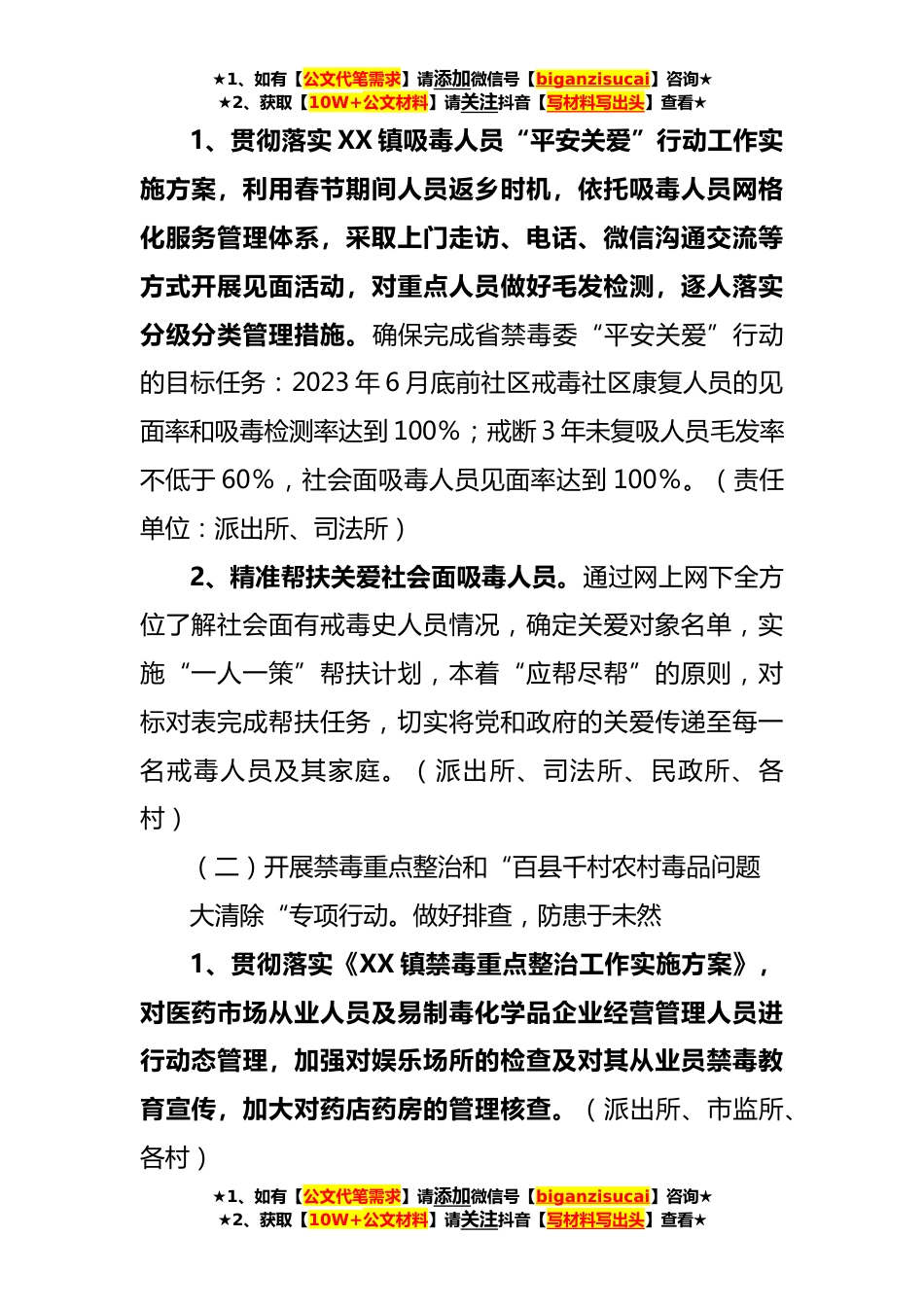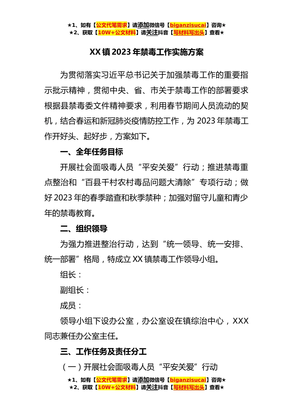 ★1、如有【公文代笔需求】请添加微信号【biganzisucai】咨询★★2、获取【10W+公文材料】请关注抖音【写材料写出头】查看★XX镇2023年禁毒工作实施方案为贯彻落实习近平总书记关于加强禁毒工作的重要指示批示精神,贯彻中央、省、市关于禁毒工作的部署要求根据县禁毒委文件精神要求,利用春节期间人员流动的契机,结合春运和新冠肺炎疫情防控工作,为2023年禁毒工作开好头、起好步,方案如下。一、全年任务目标开展社会面吸毒人员“平安关爱”行动;推进禁毒重点整治和“百县千村农村毒品问题大清除”专项行动;做好2023年的春季踏查和秋季禁种;加强对留守儿童和青少年的禁毒教育。二、组织领导为强力推进整治行动,达到“统一领导、统一安排、统一部署”格局,特成立XX镇禁毒工作领导小组。组长:副组长:成员...