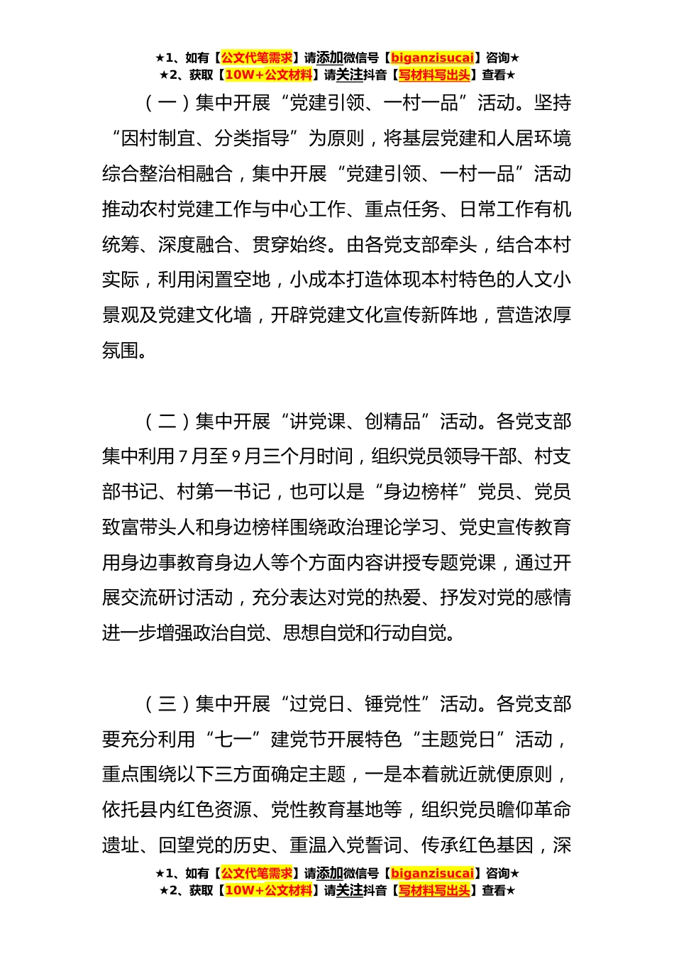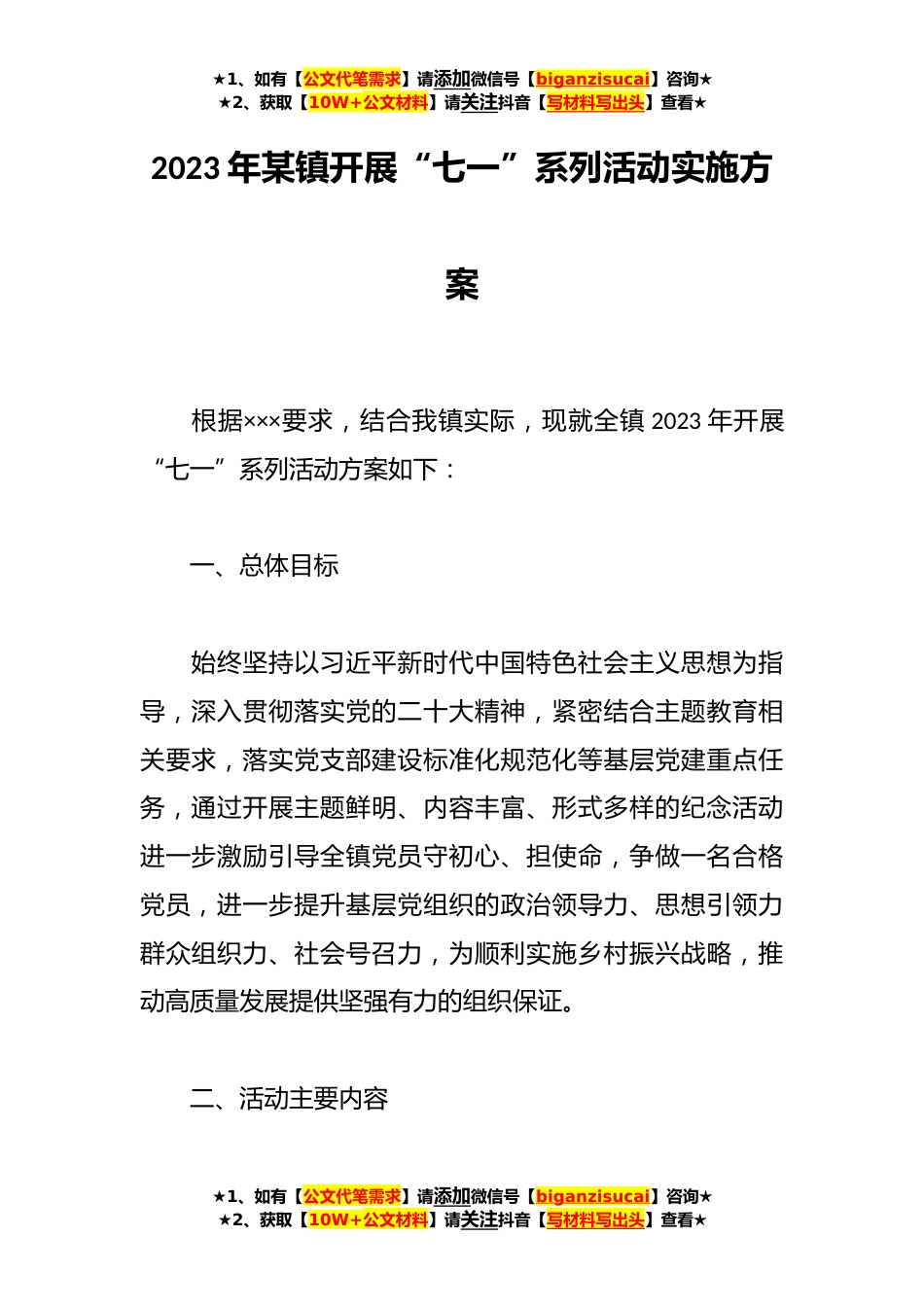 ★1、如有【公文代笔需求】请添加微信号【biganzisucai】咨询★★2、获取【10W+公文材料】请关注抖音【写材料写出头】查看★2023年某镇开展“七一”系列活动实施方案根据×××要求,结合我镇实际,现就全镇2023年开展“七一”系列活动方案如下:一、总体目标始终坚持以习近平新时代中国特色社会主义思想为指导,深入贯彻落实党的二十大精神,紧密结合主题教育相关要求,落实党支部建设标准化规范化等基层党建重点任务,通过开展主题鲜明、内容丰富、形式多样的纪念活动进一步激励引导全镇党员守初心、担使命,争做一名合格党员,进一步提升基层党组织的政治领导力、思想引领力群众组织力、社会号召力,为顺利实施乡村振兴战略,推动高质量发展提供坚强有力的组织保证。二、活动主要内容★1、如有【公文代笔需求】...
