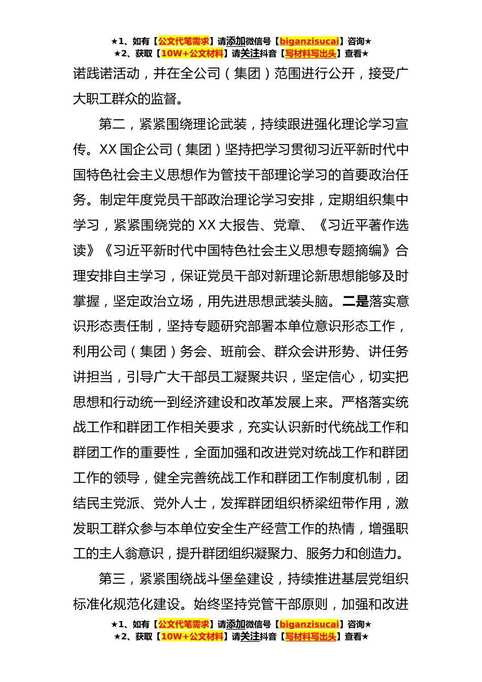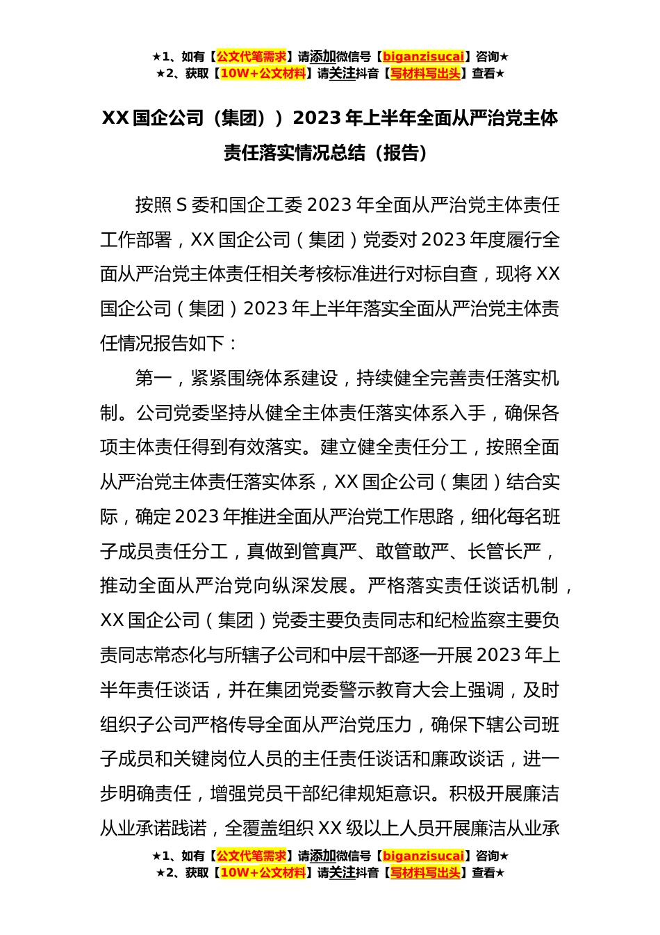 ★1、如有【公文代笔需求】请添加微信号【biganzisucai】咨询★★2、获取【10W+公文材料】请关注抖音【写材料写出头】查看★XX国企公司(集团))2023年上半年全面从严治党主体责任落实情况总结(报告)按照S委和国企工委2023年全面从严治党主体责任工作部署,XX国企公司(集团)党委对2023年度履行全面从严治党主体责任相关考核标准进行对标自查,现将XX国企公司(集团)2023年上半年落实全面从严治党主体责任情况报告如下:第一,紧紧围绕体系建设,持续健全完善责任落实机制。公司党委坚持从健全主体责任落实体系入手,确保各项主体责任得到有效落实。建立健全责任分工,按照全面从严治党主体责任落实体系,XX国企公司(集团)结合实际,确定2023年推进全面从严治党工作思路,细化每名班子成员责任分工,真做到...