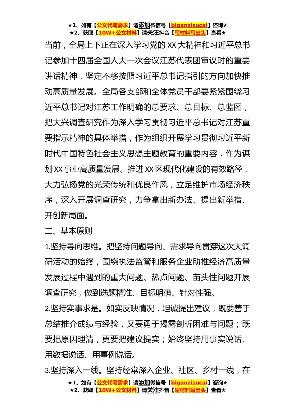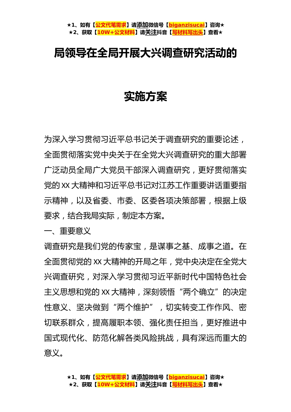 ★1、如有【公文代笔需求】请添加微信号【biganzisucai】咨询★★2、获取【10W+公文材料】请关注抖音【写材料写出头】查看★局领导在全局开展大兴调查研究活动的实施方案为深入学习贯彻习近平总书记关于调查研究的重要论述,全面贯彻落实党中央关于在全党大兴调查研究的重大部署广泛动员全局广大党员干部深入调查研究,更好贯彻落实党的XX大精神和习近平总书记对江苏工作重要讲话重要指示精神,以及省委、市委、区委各项决策部署,根据上级要求,结合我局实际,制定本方案。一、重要意义调查研究是我们党的传家宝,是谋事之基、成事之道。在全面贯彻党的XX大精神的开局之年,党中央决定在全党大兴调查研究,对深入学习贯彻习近平新时代中国特色社会主义思想和党的XX大精神,深刻领悟“两个确立”的决定性意义、坚...