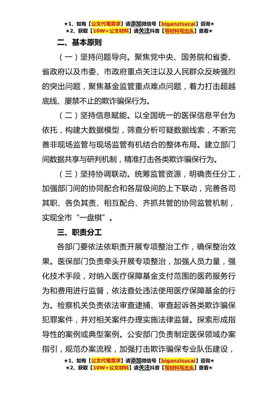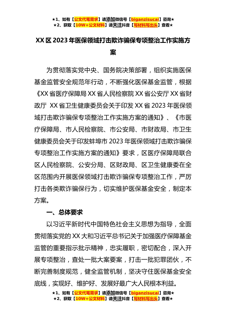 ★1、如有【公文代笔需求】请添加微信号【biganzisucai】咨询★★2、获取【10W+公文材料】请关注抖音【写材料写出头】查看★XX区2023年医保领域打击欺诈骗保专项整治工作实施方案为贯彻落实党中央、国务院决策部署,组织实施医保基金监管安全规范年行动,不断强化医保基金监管,根据《XX省医疗保障局XX省人民检察院XX省公安厅XX省财政厅XX省卫生健康委员会关于印发XX省2023年医保领域打击欺诈骗保专项整治工作实施方案的通知》、《市医疗保障局、市人民检察院、市公安局、市财政局、市卫生健康委员会关于印发蚌埠市2023年医保领域打击欺诈骗保专项整治工作实施方案的通知》要求,区医疗保障局联合区人民检察院、公安分局、区财政局、区卫生健康委在全区范围内开展医保领域打击欺诈骗保专项整治工作,严厉打击各类...