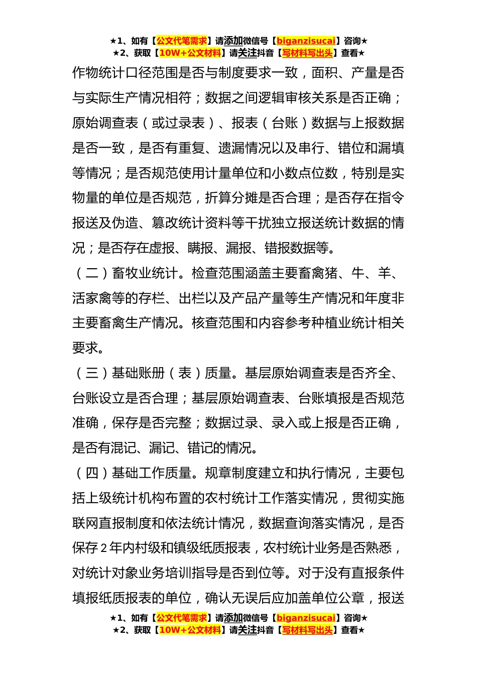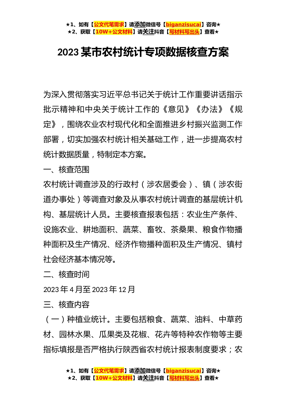 ★1、如有【公文代笔需求】请添加微信号【biganzisucai】咨询★★2、获取【10W+公文材料】请关注抖音【写材料写出头】查看★2023某市农村统计专项数据核查方案为深入贯彻落实习近平总书记关于统计工作重要讲话指示批示精神和中央关于统计工作的《意见》《办法》《规定》,围绕农业农村现代化和全面推进乡村振兴监测工作部署,切实加强农村统计相关基础工作,进一步提高农村统计数据质量,特制定本方案。一、核查范围农村统计调查涉及的行政村(涉农居委会)、镇(涉农街道办事处)等调查对象及从事农村统计调查的基层统计机构、基层统计人员。主要核查报表包括:农业生产条件、设施农业、耕地面积、蔬菜、畜牧、茶桑果、粮食作物播种面积及生产情况、经济作物播种面积及生产情况、镇村社会经济基本情况等。二、核...