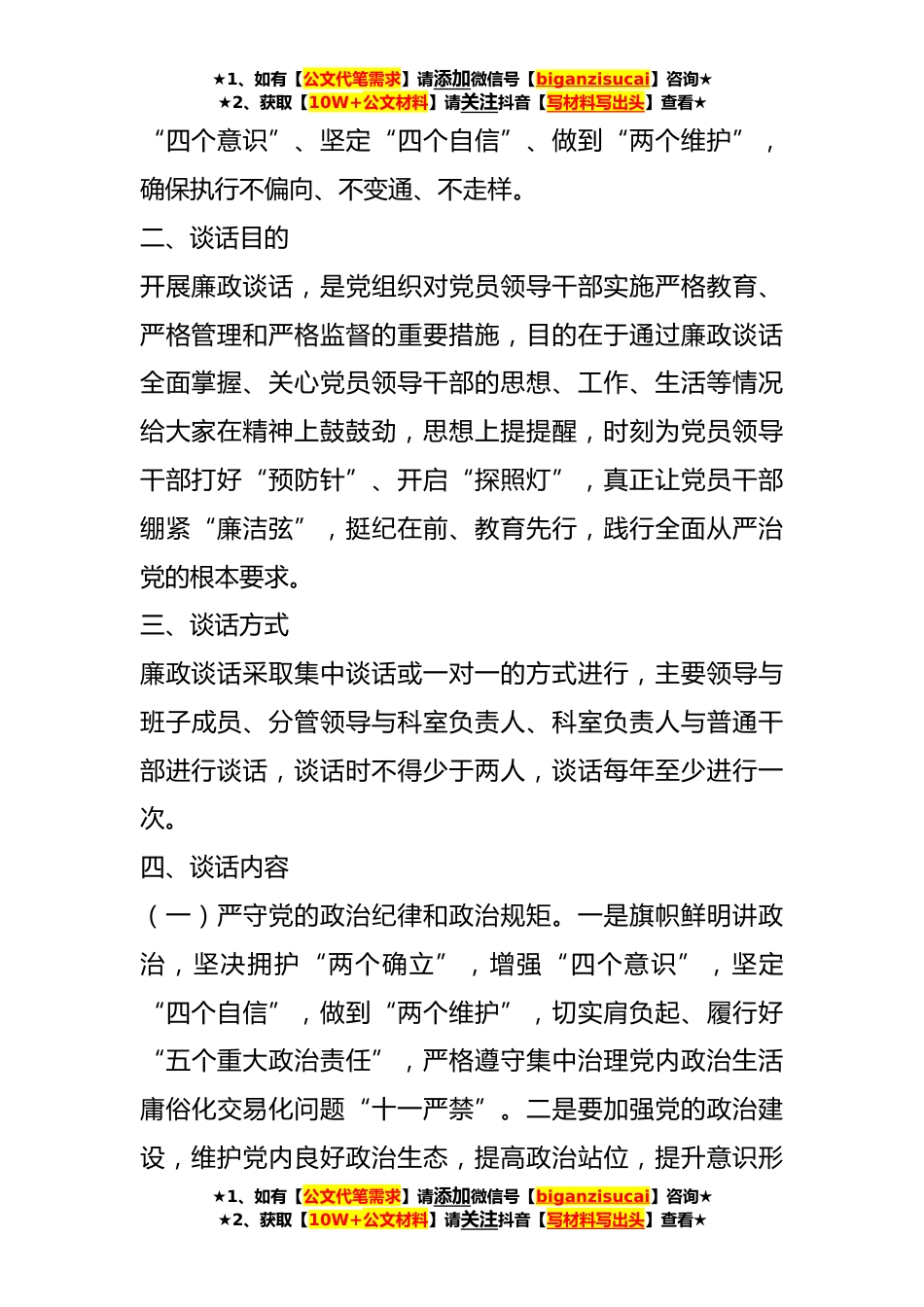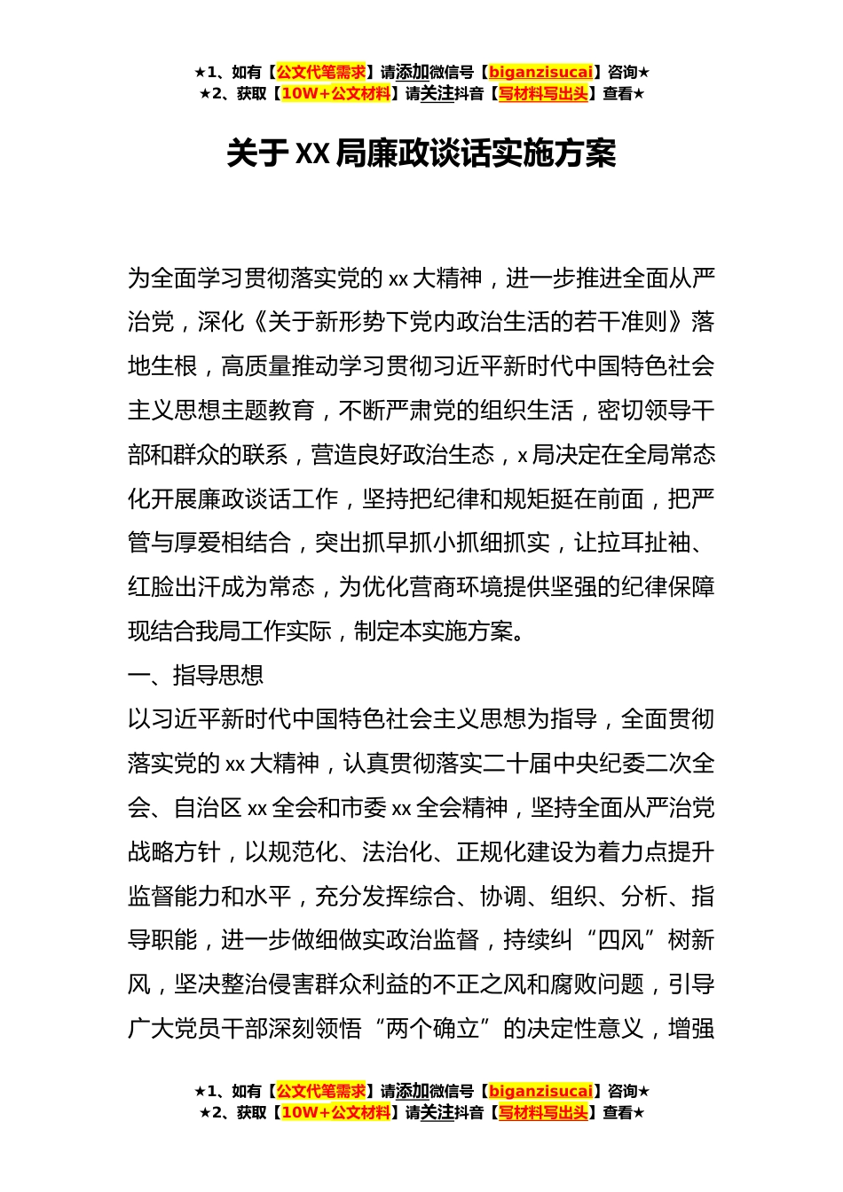 ★1、如有【公文代笔需求】请添加微信号【biganzisucai】咨询★★2、获取【10W+公文材料】请关注抖音【写材料写出头】查看★关于XX局廉政谈话实施方案为全面学习贯彻落实党的xx大精神,进一步推进全面从严治党,深化《关于新形势下党内政治生活的若干准则》落地生根,高质量推动学习贯彻习近平新时代中国特色社会主义思想主题教育,不断严肃党的组织生活,密切领导干部和群众的联系,营造良好政治生态,x局决定在全局常态化开展廉政谈话工作,坚持把纪律和规矩挺在前面,把严管与厚爱相结合,突出抓早抓小抓细抓实,让拉耳扯袖、红脸出汗成为常态,为优化营商环境提供坚强的纪律保障现结合我局工作实际,制定本实施方案。一、指导思想以习近平新时代中国特色社会主义思想为指导,全面贯彻落实党的xx大精神,认真贯...