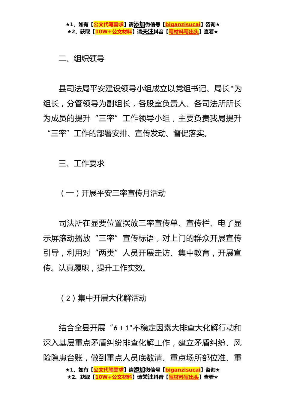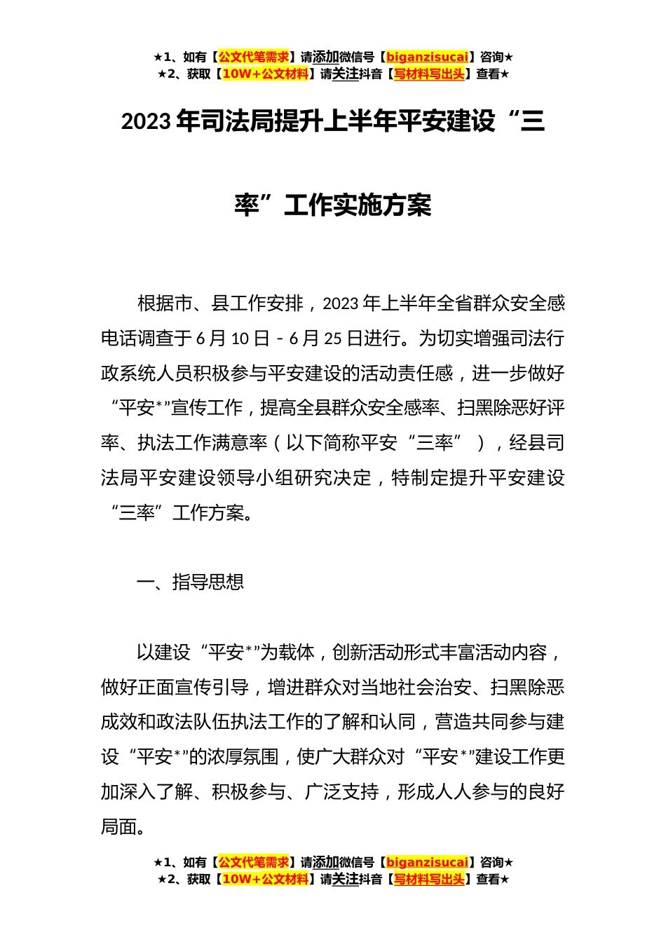 ★1、如有【公文代笔需求】请添加微信号【biganzisucai】咨询★★2、获取【10W+公文材料】请关注抖音【写材料写出头】查看★2023年司法局提升上半年平安建设“三率”工作实施方案根据市、县工作安排,2023年上半年全省群众安全感电话调查于6月10日-6月25日进行。为切实增强司法行政系统人员积极参与平安建设的活动责任感,进一步做好“平安*”宣传工作,提高全县群众安全感率、扫黑除恶好评率、执法工作满意率(以下简称平安“三率”),经县司法局平安建设领导小组研究决定,特制定提升平安建设“三率”工作方案。一、指导思想以建设“平安*”为载体,创新活动形式丰富活动内容,做好正面宣传引导,增进群众对当地社会治安、扫黑除恶成效和政法队伍执法工作的了解和认同,营造共同参与建设“平安*”的浓厚氛围,...