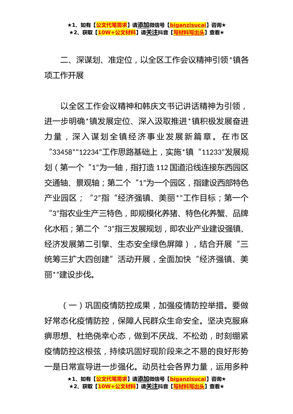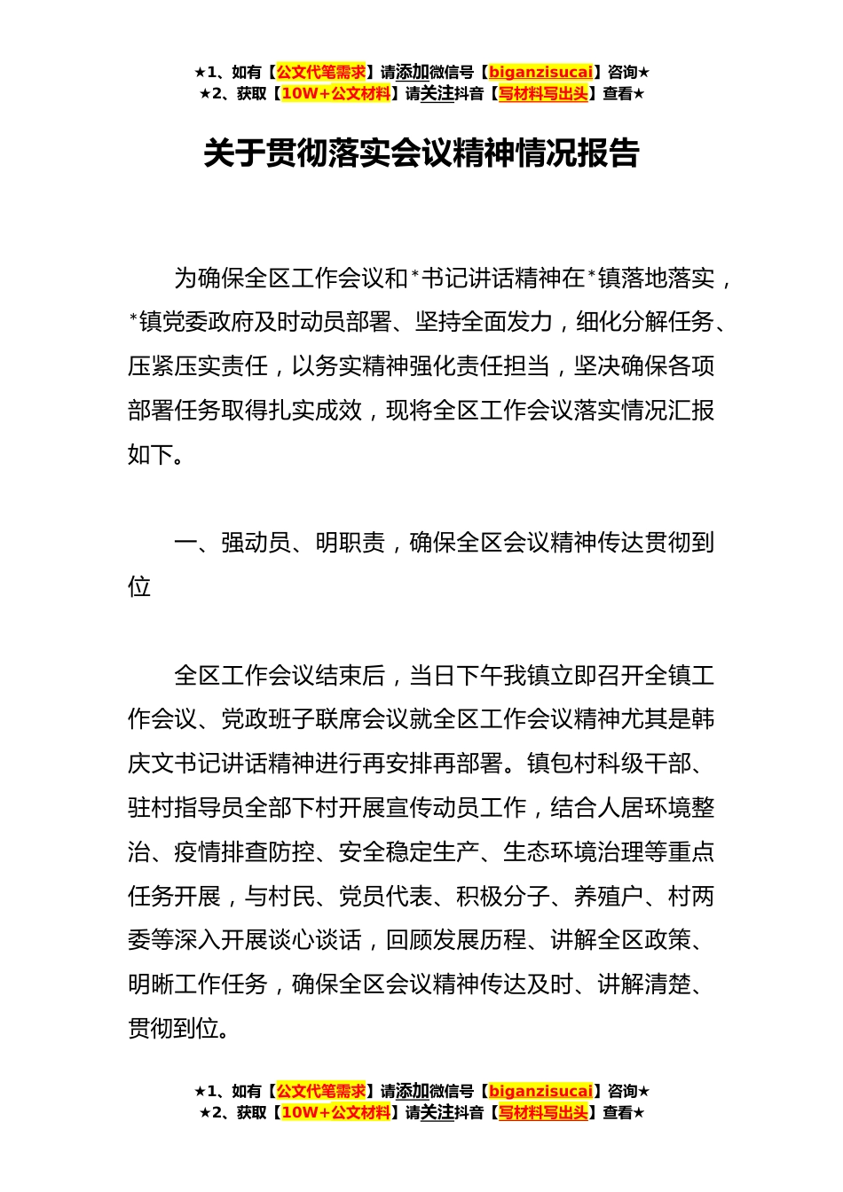 ★1、如有【公文代笔需求】请添加微信号【biganzisucai】咨询★★2、获取【10W+公文材料】请关注抖音【写材料写出头】查看★关于贯彻落实会议精神情况报告为确保全区工作会议和*书记讲话精神在*镇落地落实,*镇党委政府及时动员部署、坚持全面发力,细化分解任务、压紧压实责任,以务实精神强化责任担当,坚决确保各项部署任务取得扎实成效,现将全区工作会议落实情况汇报如下。一、强动员、明职责,确保全区会议精神传达贯彻到位全区工作会议结束后,当日下午我镇立即召开全镇工作会议、党政班子联席会议就全区工作会议精神尤其是韩庆文书记讲话精神进行再安排再部署。镇包村科级干部、驻村指导员全部下村开展宣传动员工作,结合人居环境整治、疫情排查防控、安全稳定生产、生态环境治理等重点任务开展,与村民、...